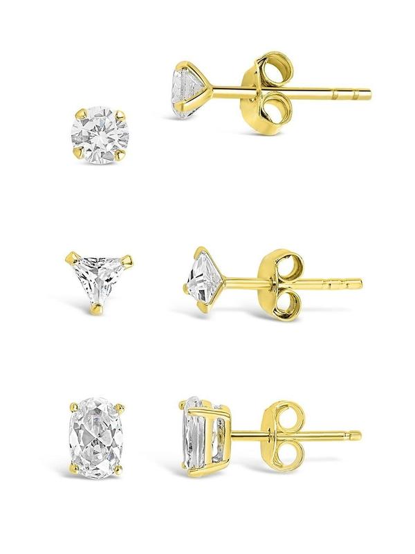Looking for the perfect set of studs to wear every day? Look no further! This set includes three pairs of CZ studs -- round, triangular, and square. Sparkle everywhere you go in the gold and silver tones!