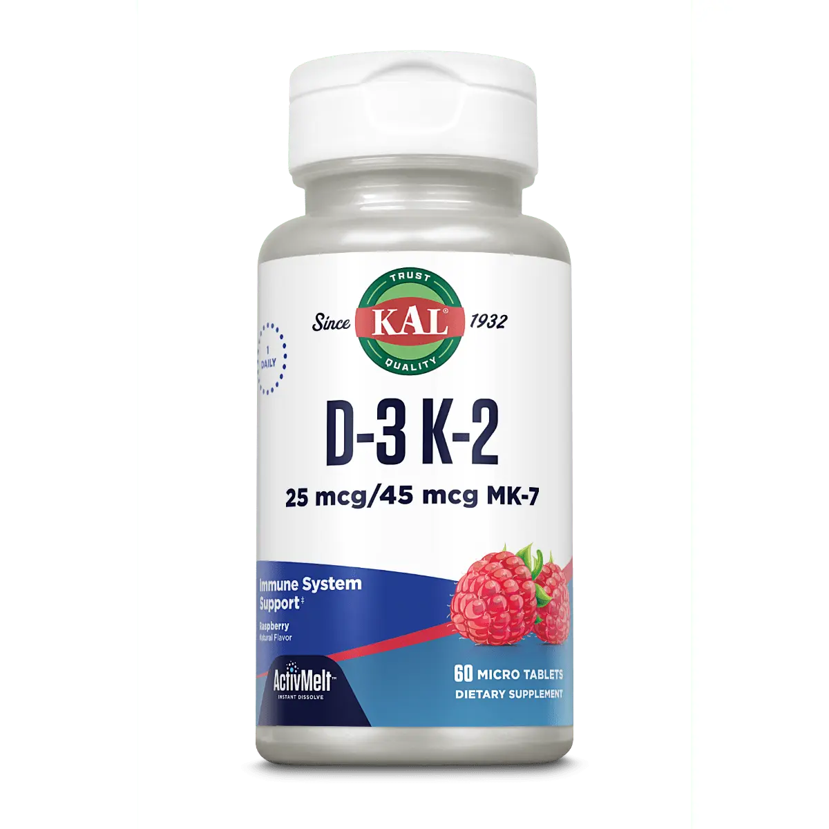 At KAL, innovation is key. That’s why we formulated our ActivMelt® micro tablets that instantly dissolve and allow the body to quickly absorb the D-3 and K-2. And with a delicious natural raspberry flavor, taking your daily supplement is not only convenient, but also enjoyable.