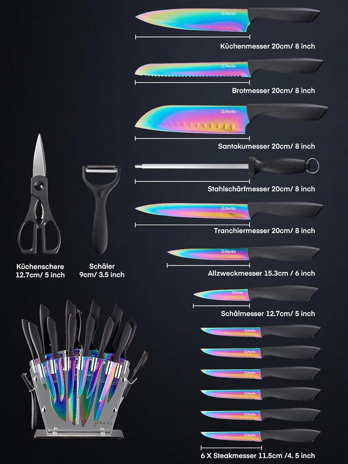 ·VALUABLE KNIFE SET The fantastic knife set includes kitchen knives, carving knives, bread knives, steel sharpening knives, santoku knives, utility knives, paring knives, 6 piece steak knife, kitchen scissors, peelers, acrylic knife holders that cover all cutting needs in the kitchen, from vegetable to meat cutting