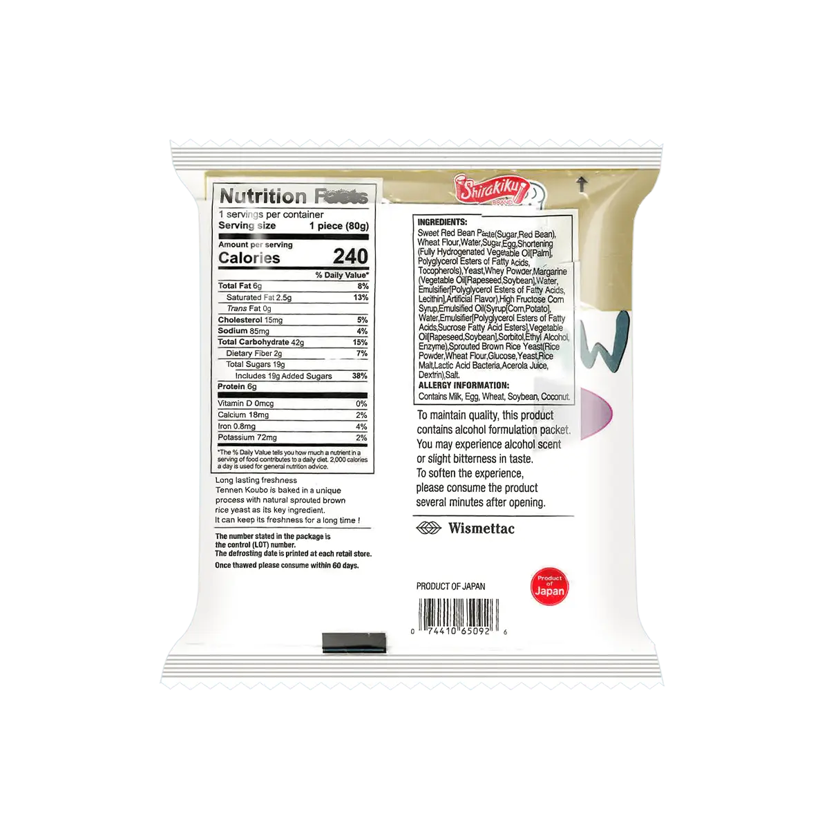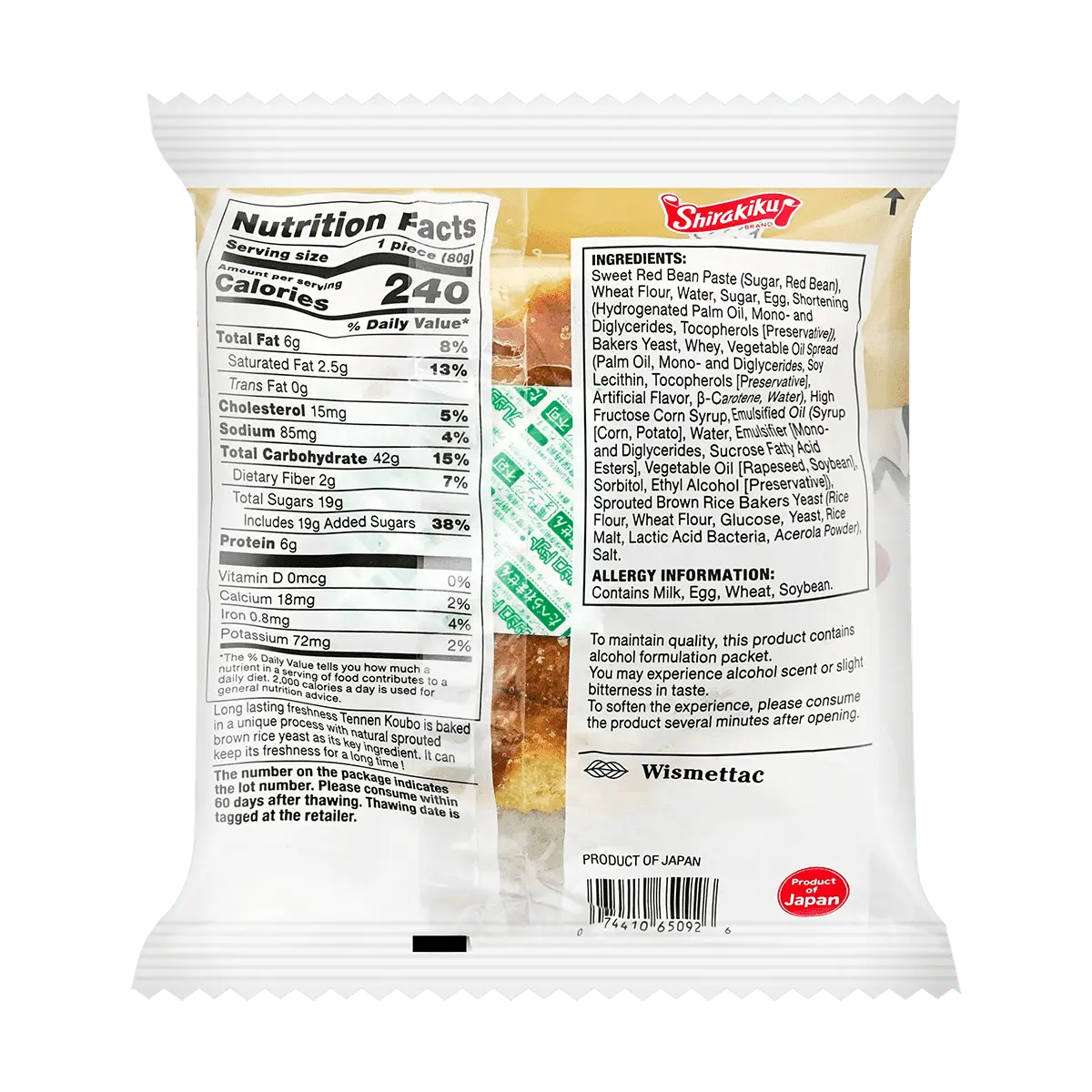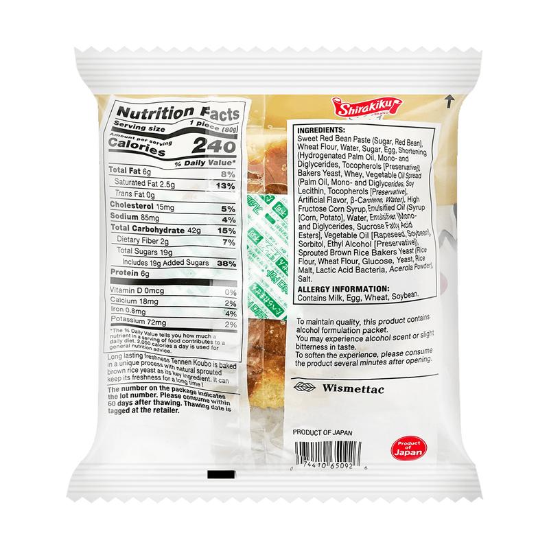 ·Sweet Red Bean Paste (Sugar, Red Bean), Wheat Flour, Water, Sugar, Egg, Shortening (Fully Hydrogenated Vegetable Oil (Palm), Polyglycerol Esters of Fatty Acids,Tocopherols), Yeast, Whey Powder, Magarine (Vegetable Oil (Rapeseed, Soybean), Water, Emulsifier (Polyglycerol Esters of Fatty Acids, Lecithin), Artificial Flavor), High Fructose Corn Syrup, Emulsifier (Polyglycerol Esters of Fatty Acids, Sucrose Fatty Acid Esters), Vegetable Oil (Rapeseed, Soybean), Sorbitol, Ethyl Alcohol, Enzyme), Sprouted Brown Rice Yeast (Rice Powder, Wheat Flour, Glucose, Yeast, Rice Malt, Lactic Acid Bacteria, Acerola,Juice, Dextrin), Salt.