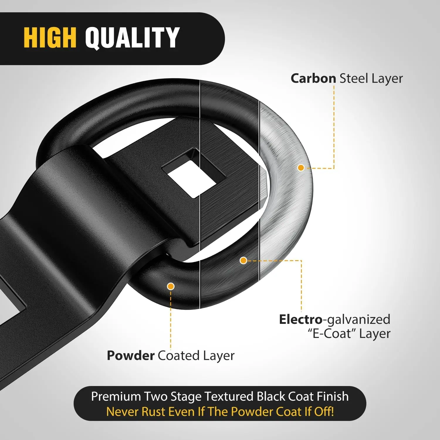 ·【No Rust】- Heavy Duty D Rings Tie Down Anchors is coated with black layer to prevent corrosion and rust. To ensure our d ring has excellent strength and provides the superior durability your towing needs.