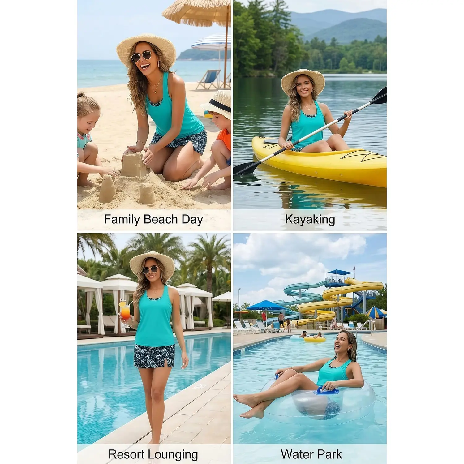 ·Tummy Control Swimsuits for Women: The loose fit tankini top effectively conceals the tummy, while the high-waisted swim skirt offers modest coverage and a smoothing effect. The skirt's built-in shorts and subtle side slit provide a secure, full-coverage fit and ease of movement for all activities.