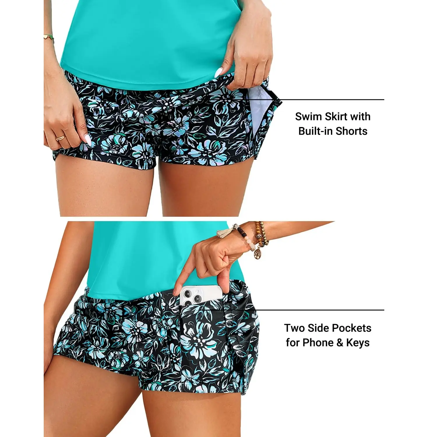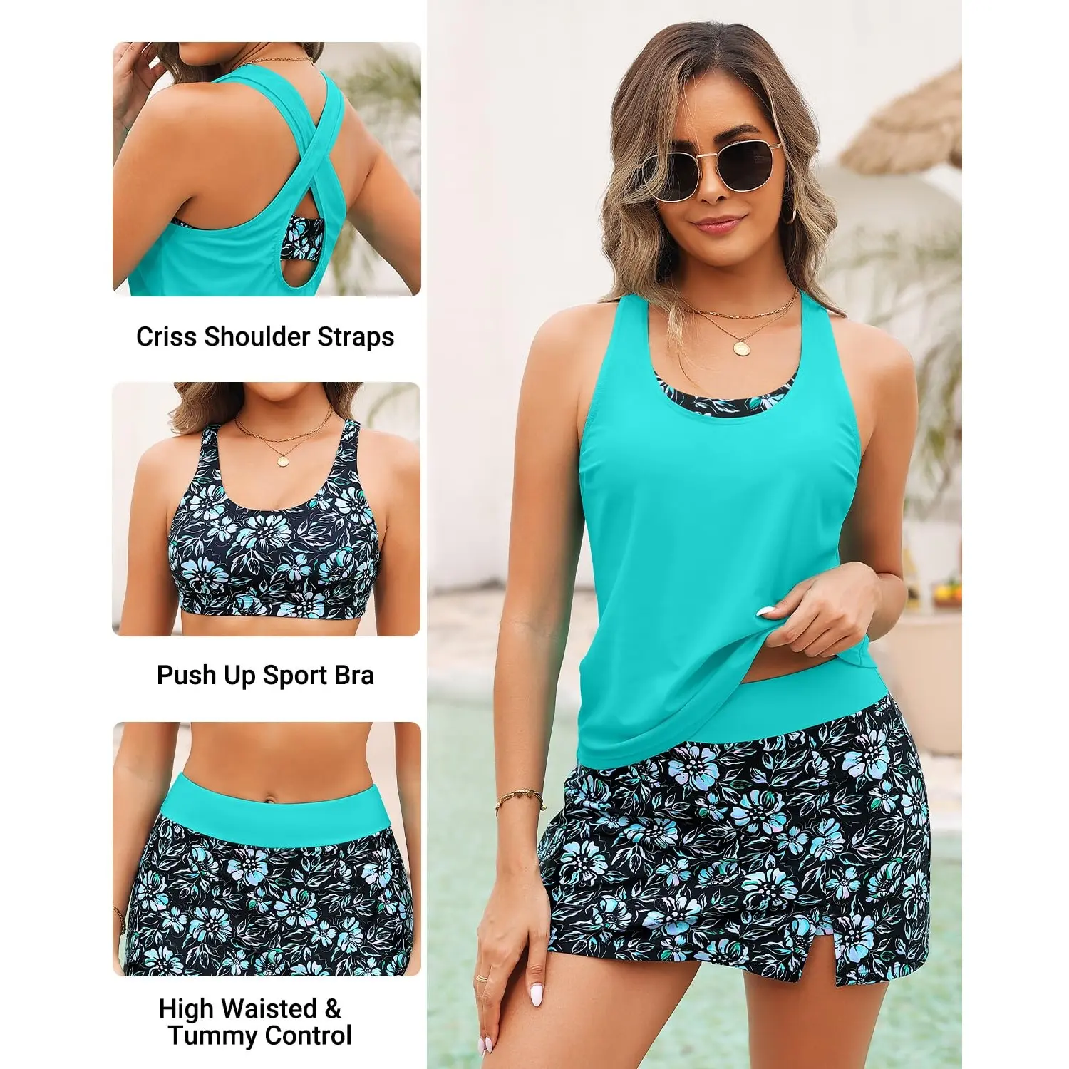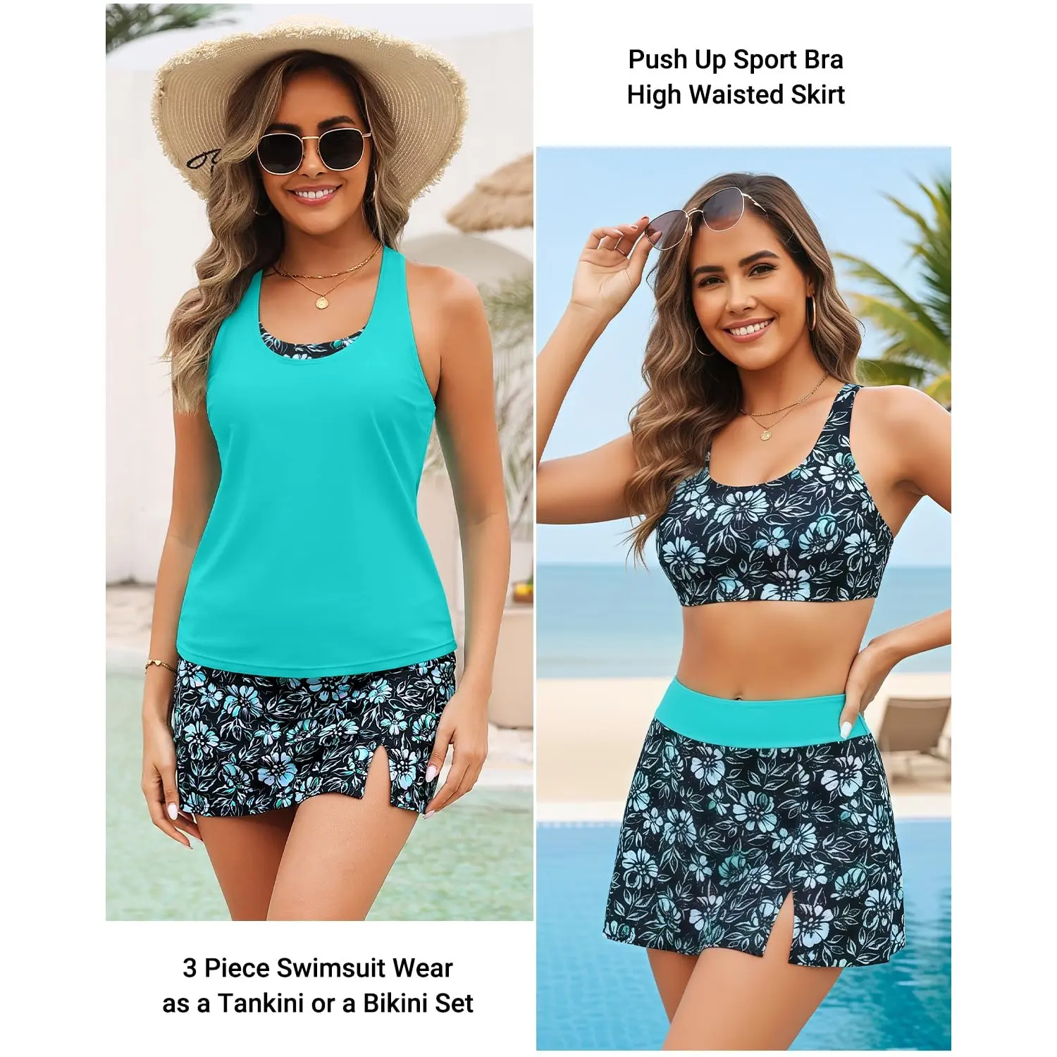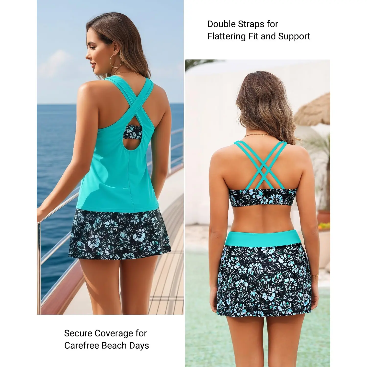 ·Versatile three Piece Tankini Swimsuits Mix & Match: The Teal Flower tankini set includes a swim tank top, sports bra, and a high-waisted swim skirt. Mix and match for two stylish looks—from a modest tankini to a chic bikini/skirt set.