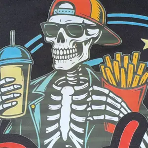 The graphic on the front is much larger than in the photos, awkwardly big. It is placed too high, too far to the left & crooked. Graphics are dull and look much nicer online. The skull graphics are really blurry and there are weird lines throughout the design. The graphics look distorted and bad.