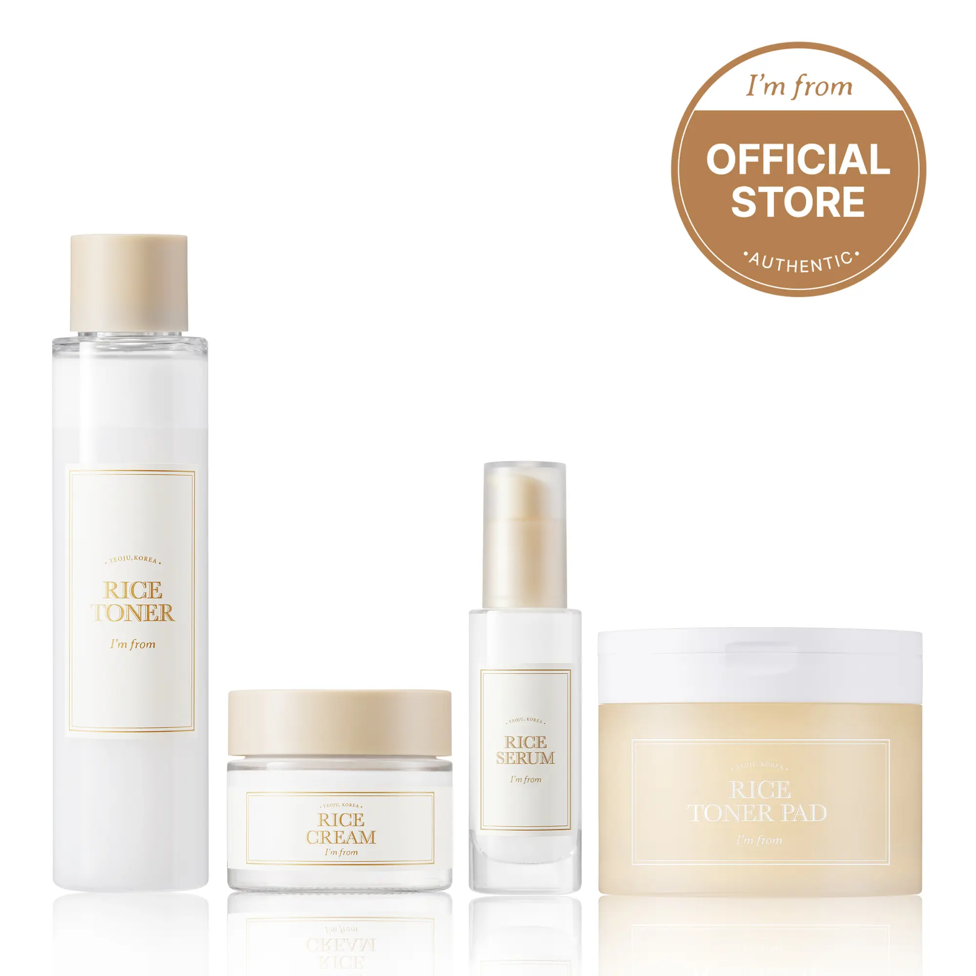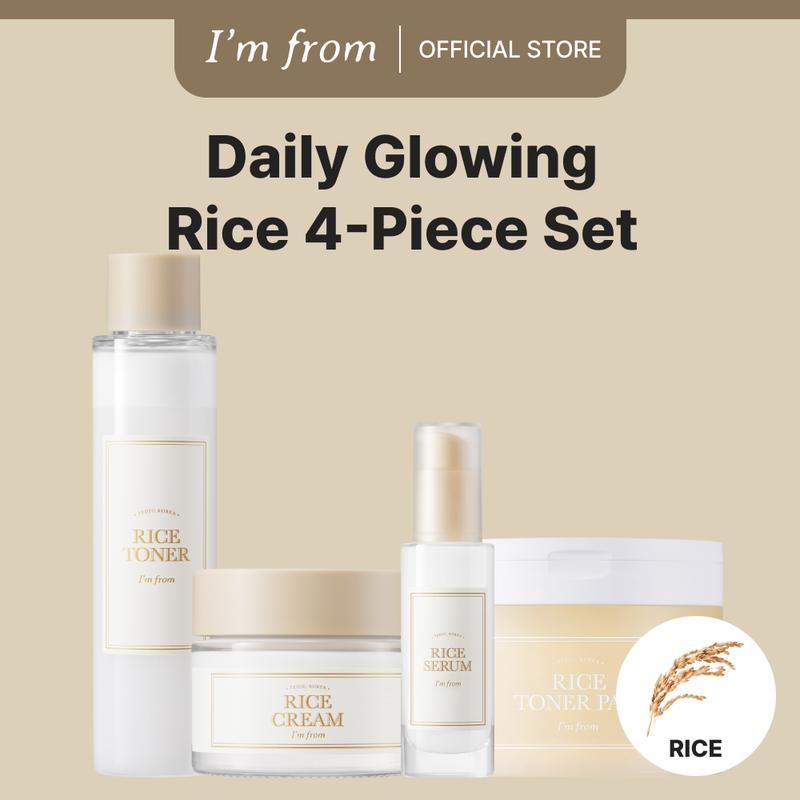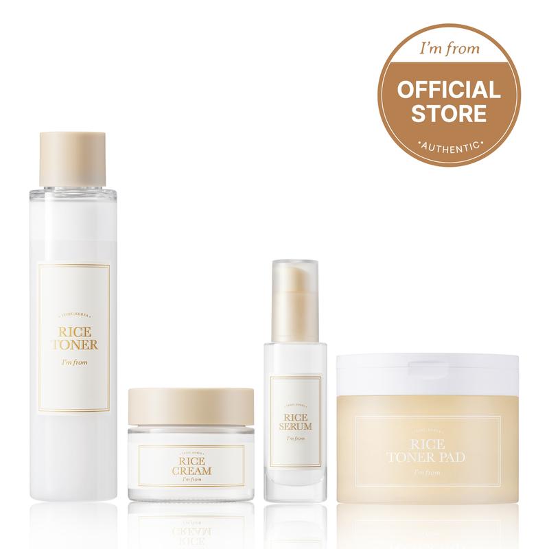 Experience the nourishing benefits of rice with the I'M FROM Official Shop Korean Rice Skincare Set. This bestselling set includes a rice toner, rice serum, rice cream, and rice toner pad.