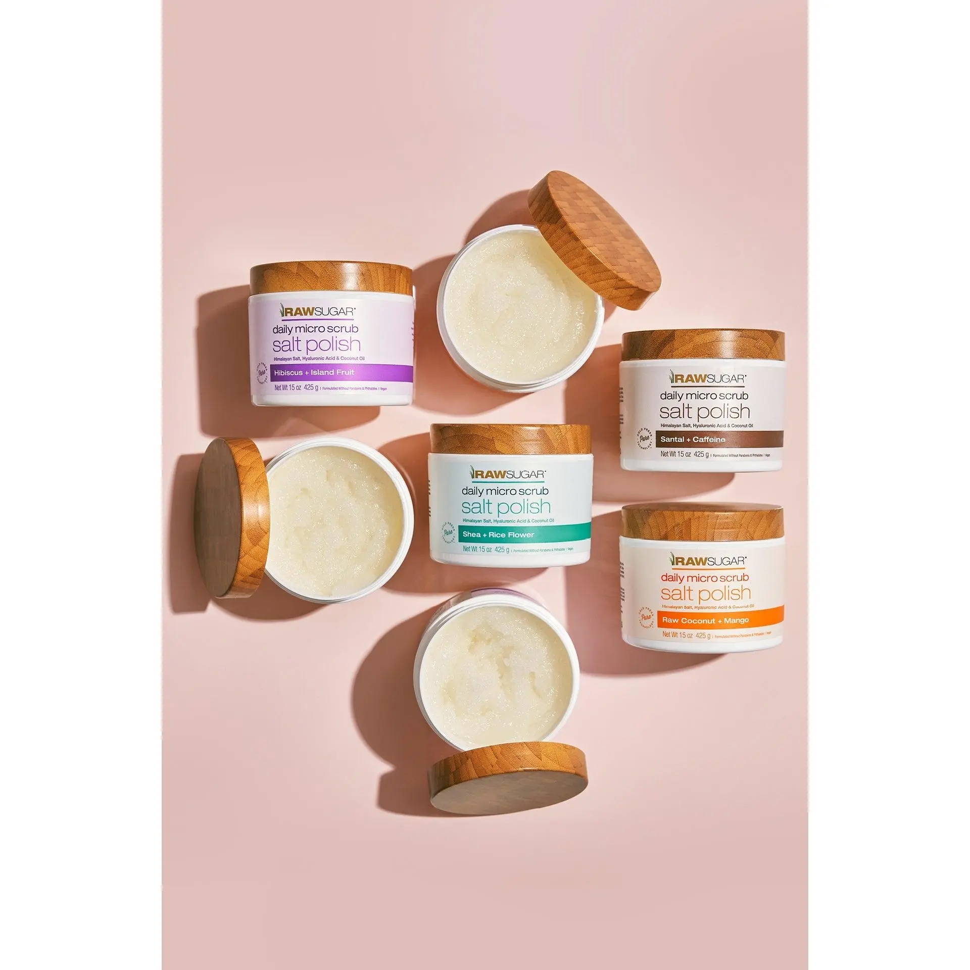 Love your skin from the outside in with Raw Sugar's Daily Micro Scrub Salt Polish. Crafted with a unique blend of Himalayan Sea Salt, Hyaluronic Acid and Coconut Oil, our new salt-based formula is designed to help exfoliate and detoxify, revealing brighter, smoother skin. Intended for daily use, this gentle formula leaves skin totally refreshed with a protective moisture veil. Skin is replenished to a soft, supple and glowing state, radiating good vibes.