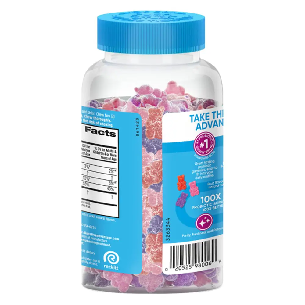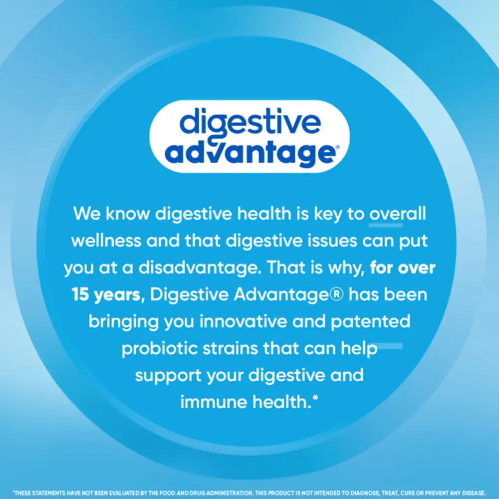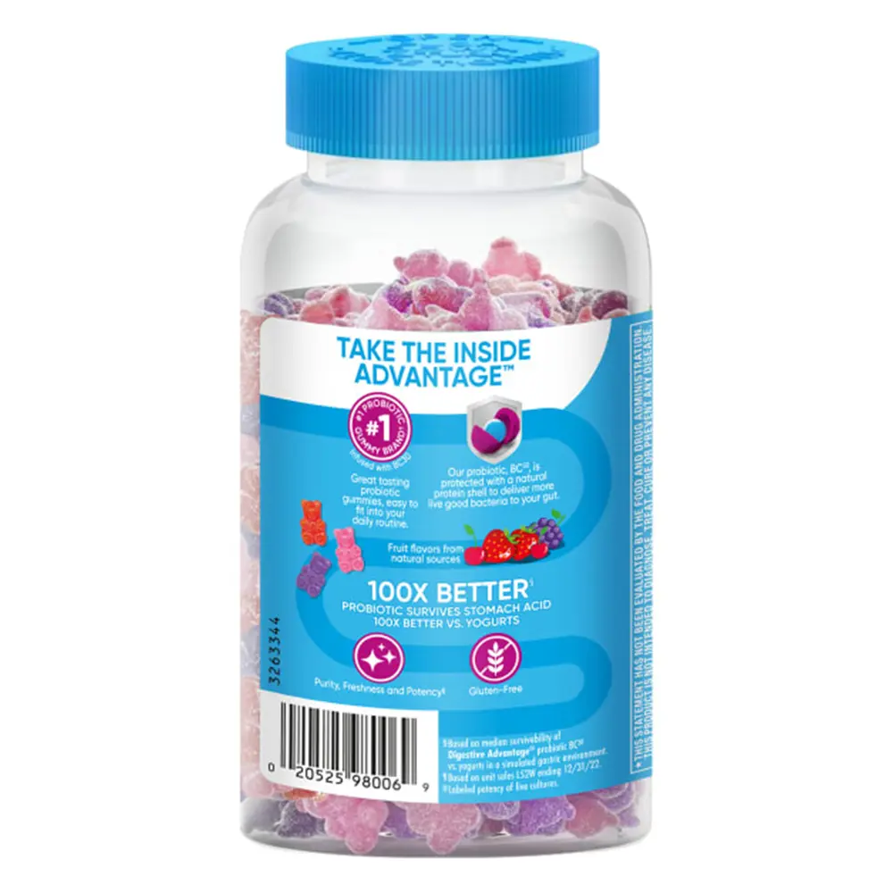 Digestive Advantage Daily Probiotic Gummies are an easy and delicious way to get your daily probiotics. They are made with natural fruit flavors, so they are guilt free. These daily probiotic gummies help support your overall digestive and immune health. They also help lessen minor abdominal discomfort and occasional bloating. WHAT ARE PROBIOTICS: Probiotics are good bacteria that are naturally found inside the human body and help support overall health - including digestive and immune health. The probiotics found in many supplements cannot survive the harsh acids to get to the intestines where they do their work. But Digestive Advantage contains BC30, a patented probiotic that survives 100x better than leading yogurts‡ so it can deliver good bacteria where you need it. THESE STATEMENTS HAVE NOT BEEN EVALUATED BY THE FOOD AND DRUG ADMINISTRATION. THIS PRODUCT IS NOT INTENDED TO DIAGNOSE, TREAT, CURE OR PREVENT ANY DISEASE. vs. product offering 50 billion live cultures. ‡Based on median survivability of Digestive Advantage probiotic BC30 vs leading yogurts in a simulated gastric environment.