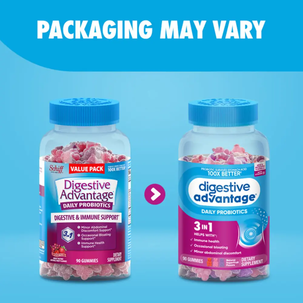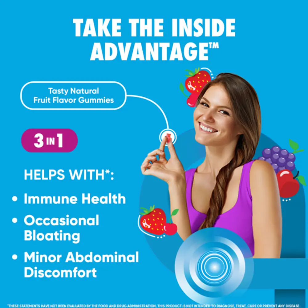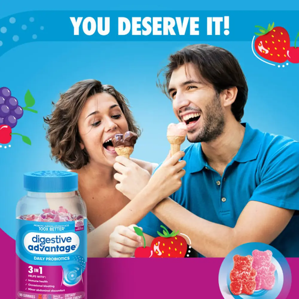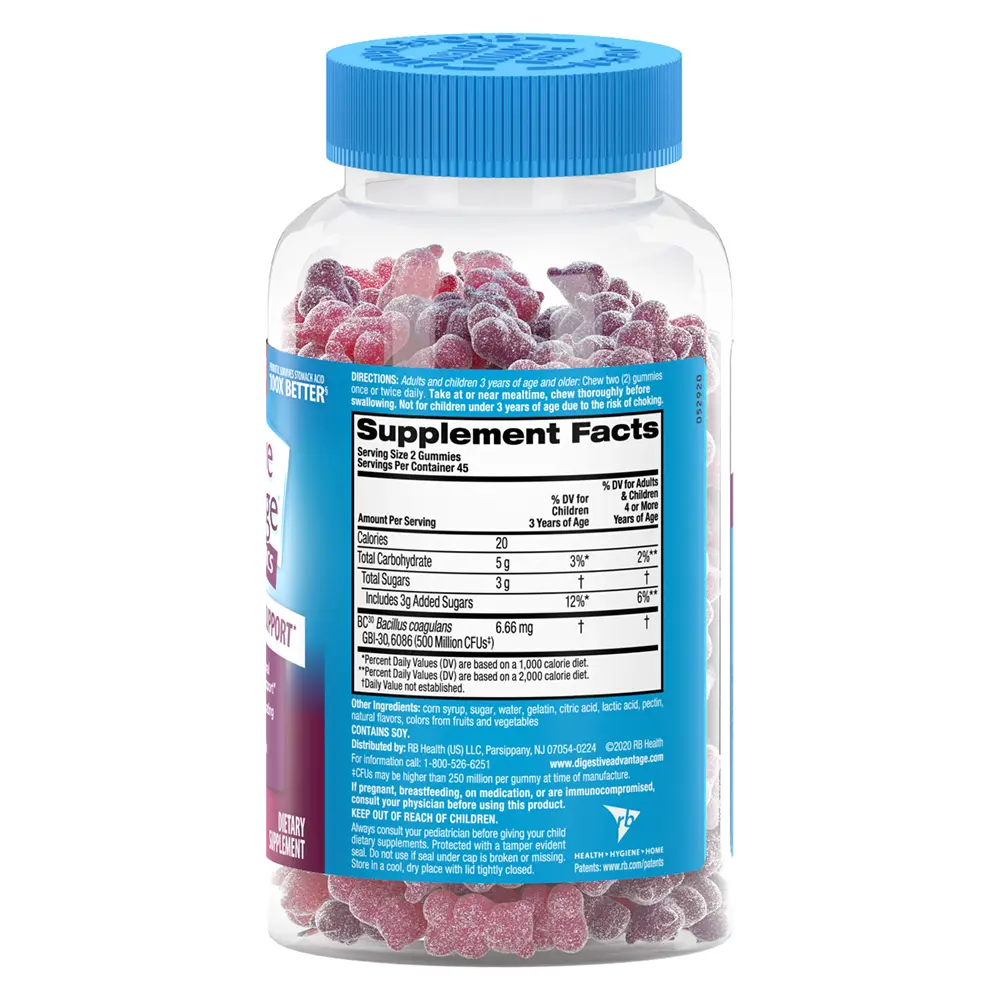 Digestive Advantage Daily Probiotic Gummies are an easy and delicious way to get your daily probiotics. They are made with natural fruit flavors, so they are guilt free. These daily probiotic gummies help support your overall digestive and immune health. They also help lessen minor abdominal discomfort and occasional bloating. WHAT ARE PROBIOTICS: Probiotics are good bacteria that are naturally found inside the human body and help support overall health - including digestive and immune health. The probiotics found in many supplements cannot survive the harsh acids to get to the intestines where they do their work. But Digestive Advantage contains BC30, a patented probiotic that survives 100x better than leading yogurts‡ so it can deliver good bacteria where you need it. THESE STATEMENTS HAVE NOT BEEN EVALUATED BY THE FOOD AND DRUG ADMINISTRATION. THIS PRODUCT IS NOT INTENDED TO DIAGNOSE, TREAT, CURE OR PREVENT ANY DISEASE. vs. product offering 50 billion live cultures. ‡Based on median survivability of Digestive Advantage probiotic BC30 vs leading yogurts in a simulated gastric environment.