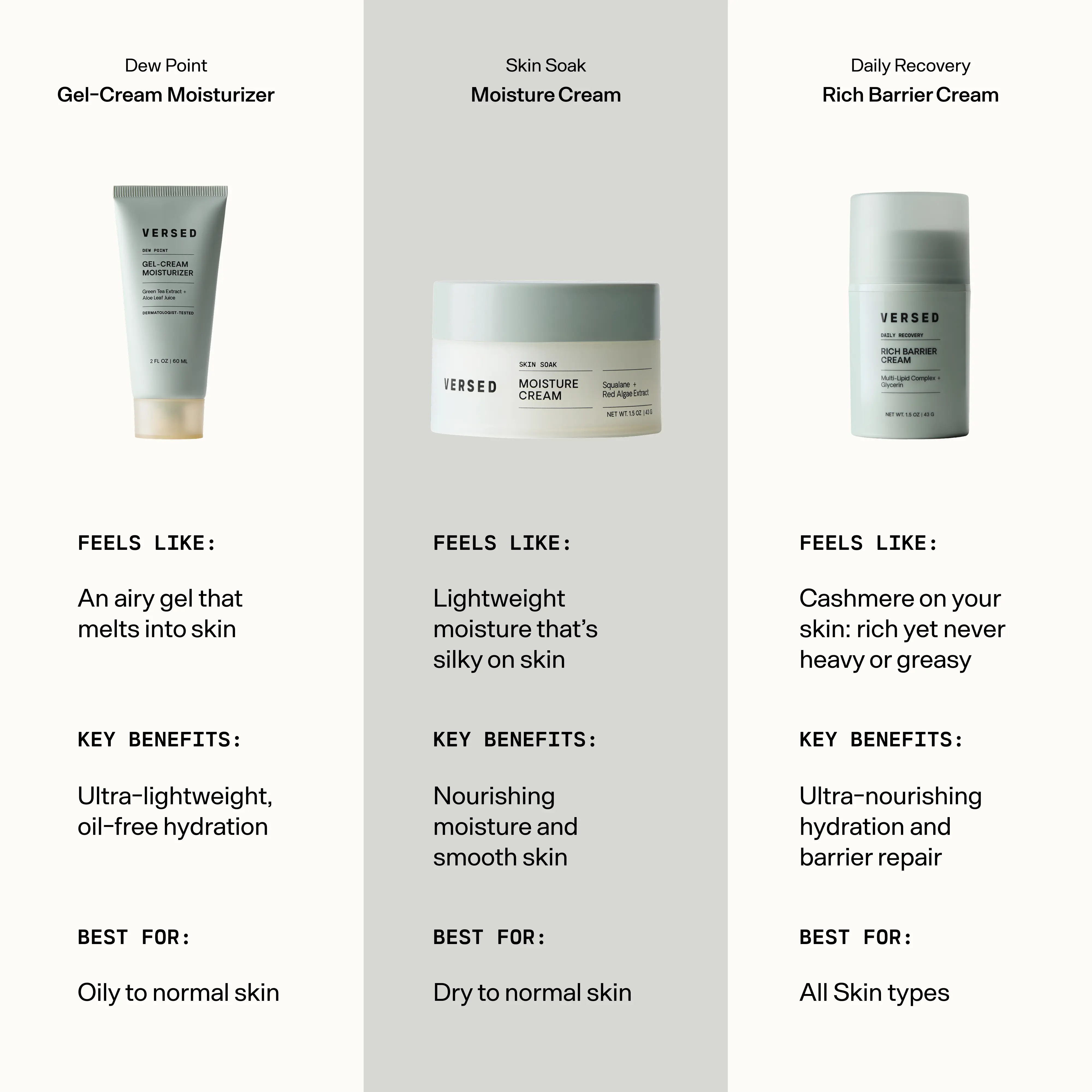 I recently switched to Versed and I can't say enough! The Daily Recovery is my new go-to for moisturizers. It's thick, non-greasy, light weight, and leaves my skin feeling hydrated and supported throughout the day. I've noticed my skin looks brighter and younger after every use.