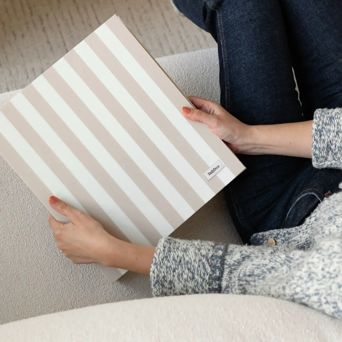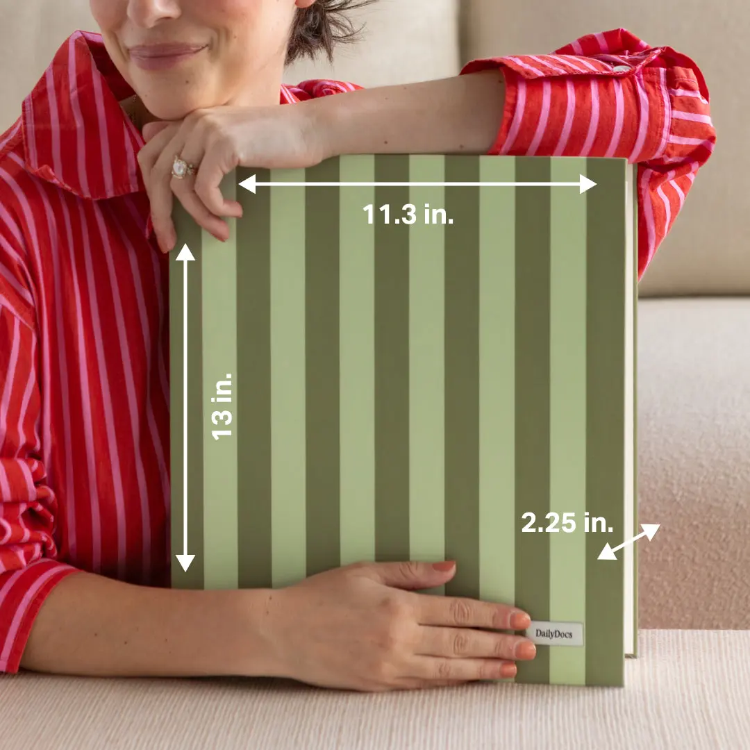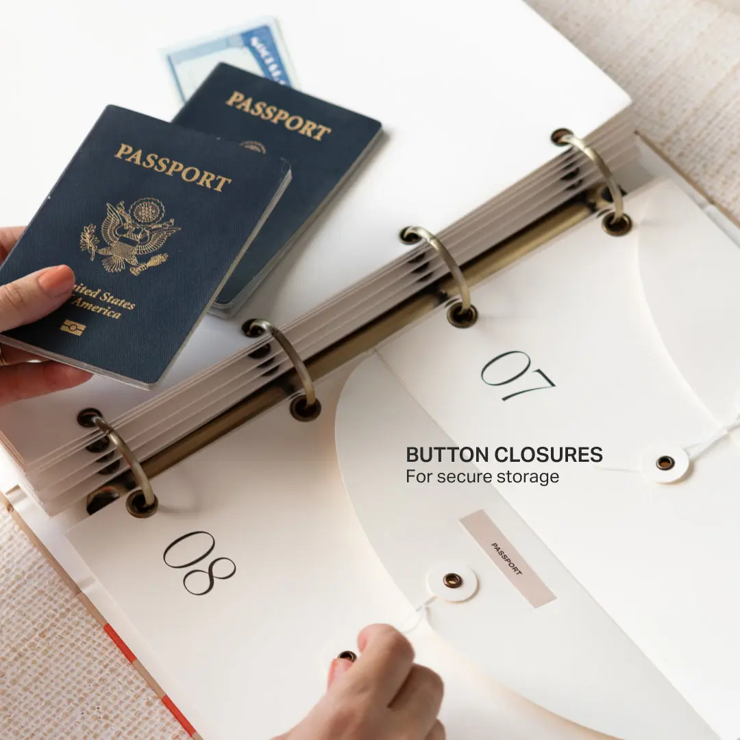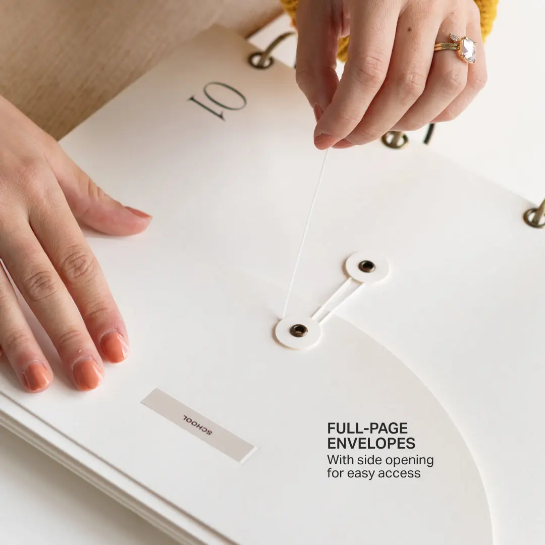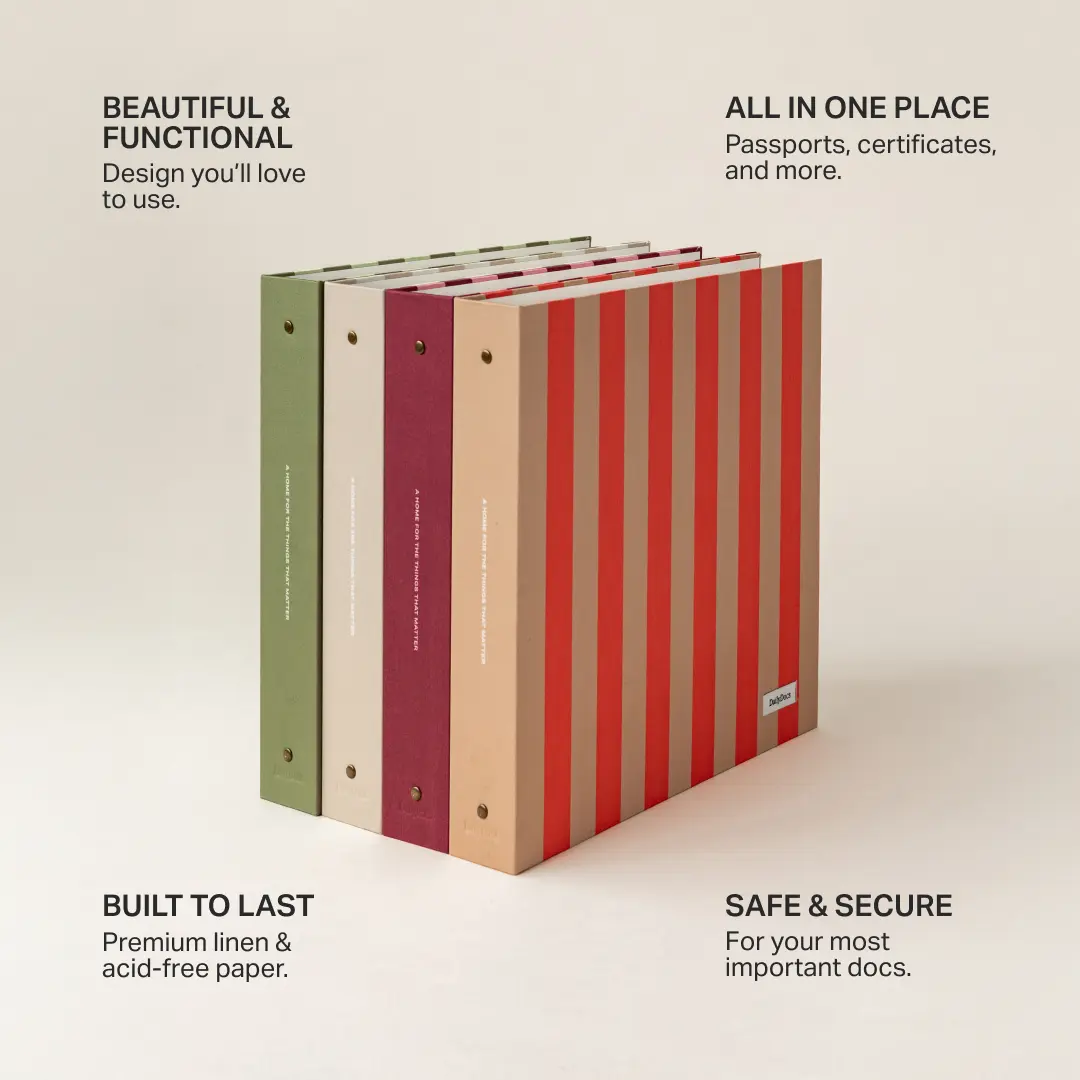 A cotton-linen blend hardcover with a durable, expandable 4-ring binder. Acid-free paper protects your documents from yellowing, so everything stays preserved for years to come.
