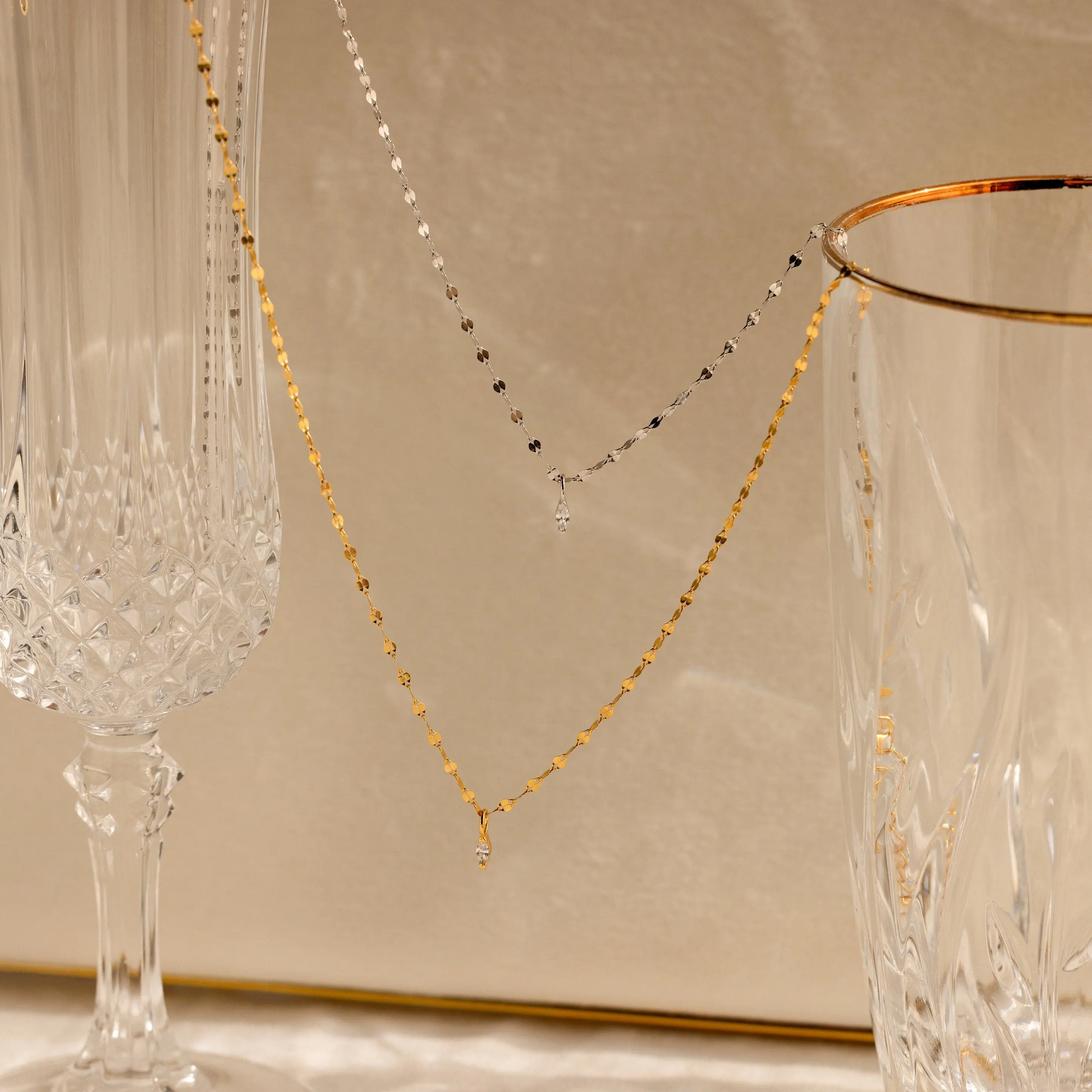·Featured Styles: Model showcases a minimalist, balanced layering look featuring our Josephine Chain Necklace and Diamond Tennis Choker Necklace.