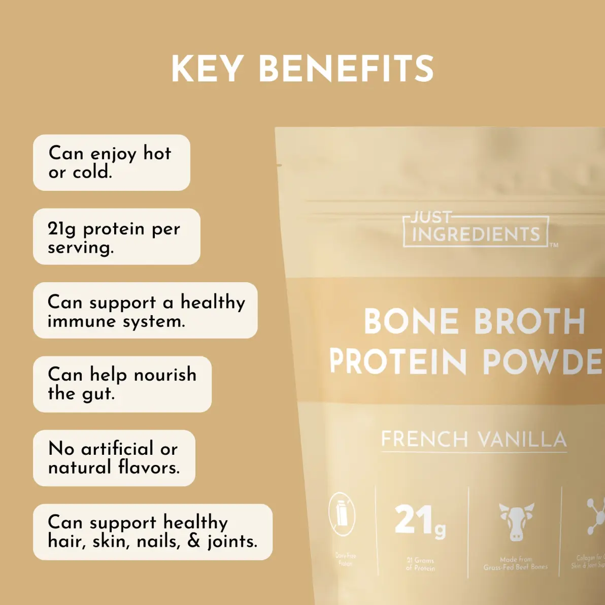 ·Collagen for Skin & Joints: A blend of grass-fed bone broth and added grass-fed collagen, to support healthy skin, hair, nails, and joints.
