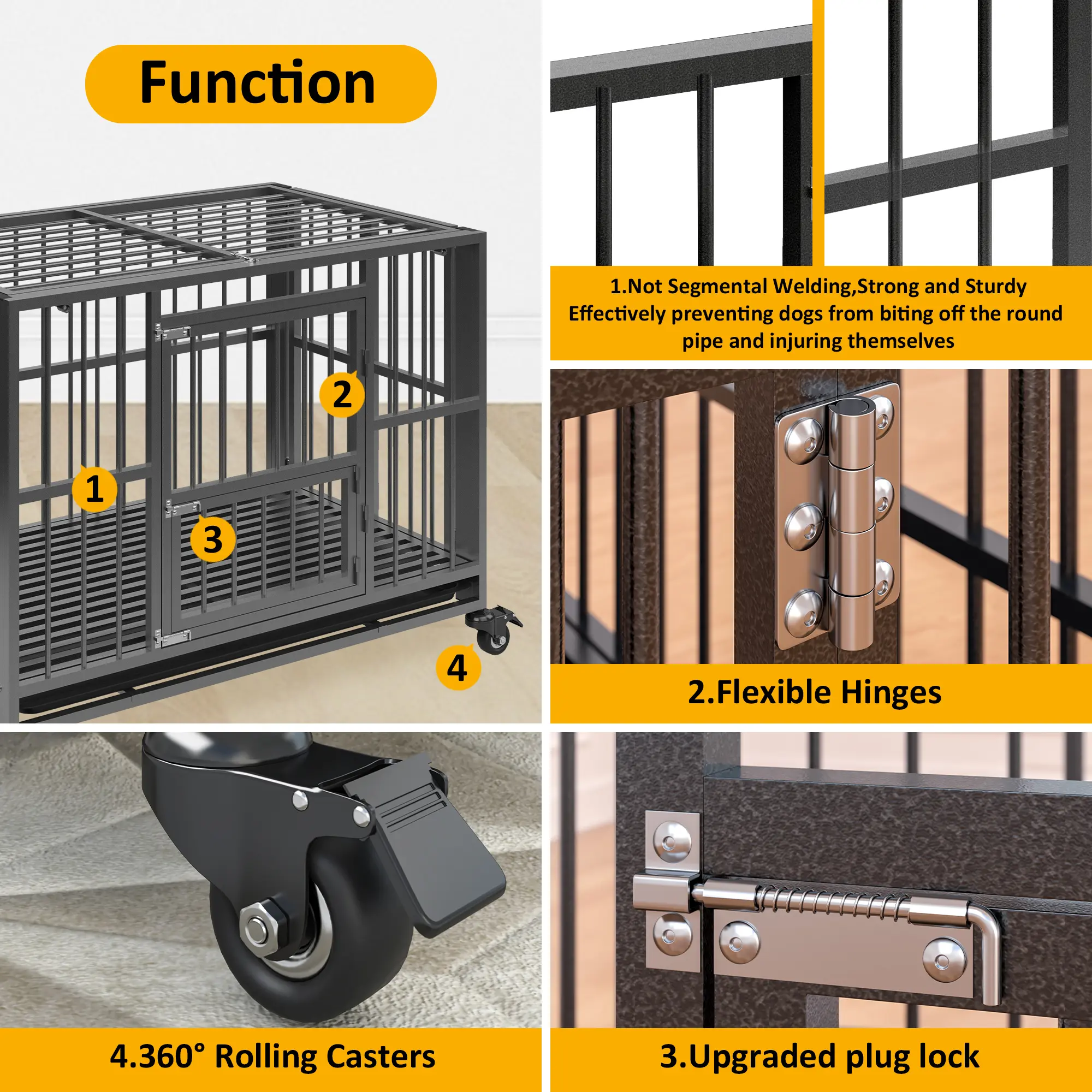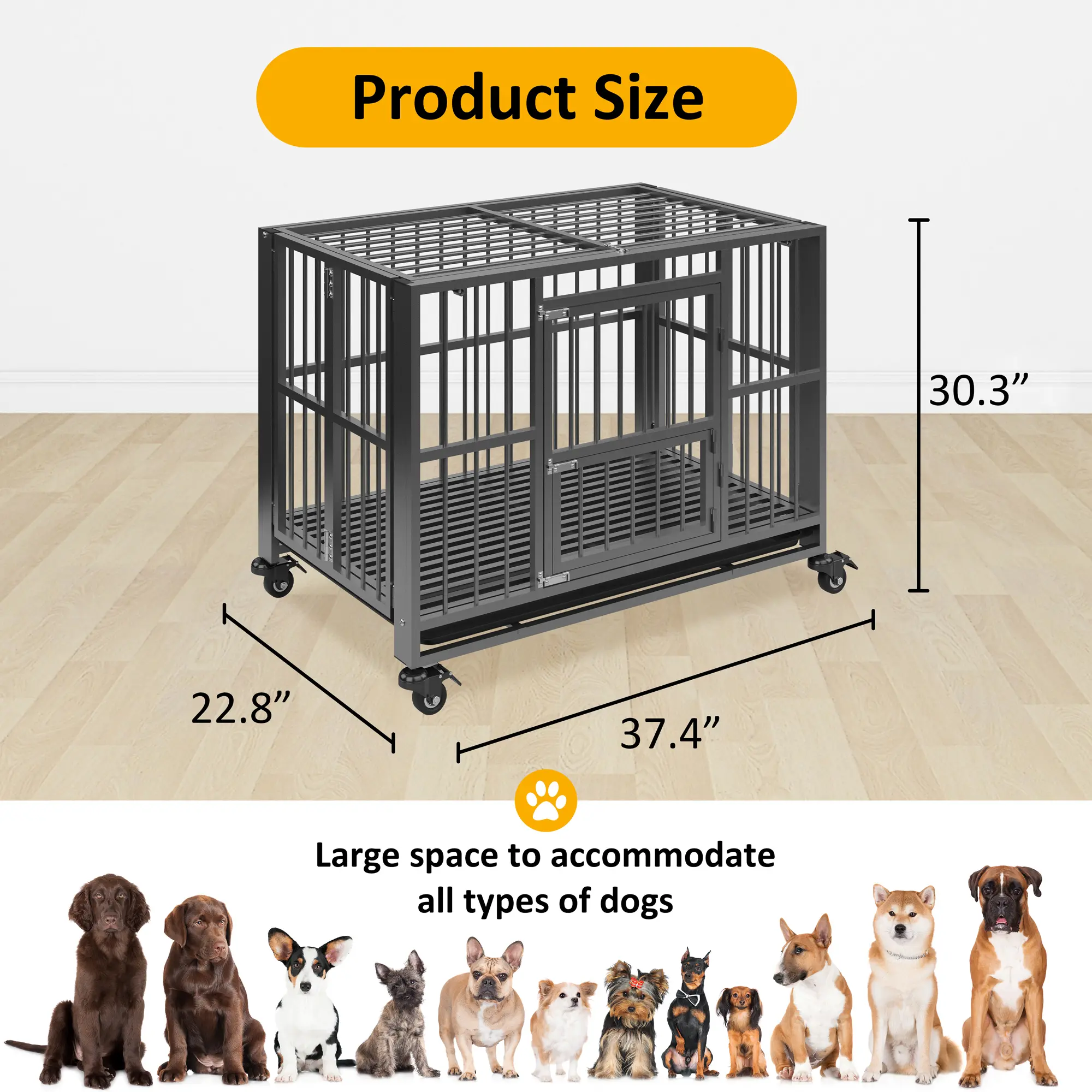 ·Excellent Mobility and Security: Equipped with four 360-degree swivel casters, this large dog kennel offers unparalleled maneuverability around your home. ALL of the casters feature locking mechanisms to anchor the crate securely in place. Enhanced with double upgrade bolt locks, this crate provides peace of mind for pet owners of anxious dogs, preventing any potential damage or harm. The dual-door design facilitates easy access for your furry friend while promoting interaction and feeding opportunities for you.