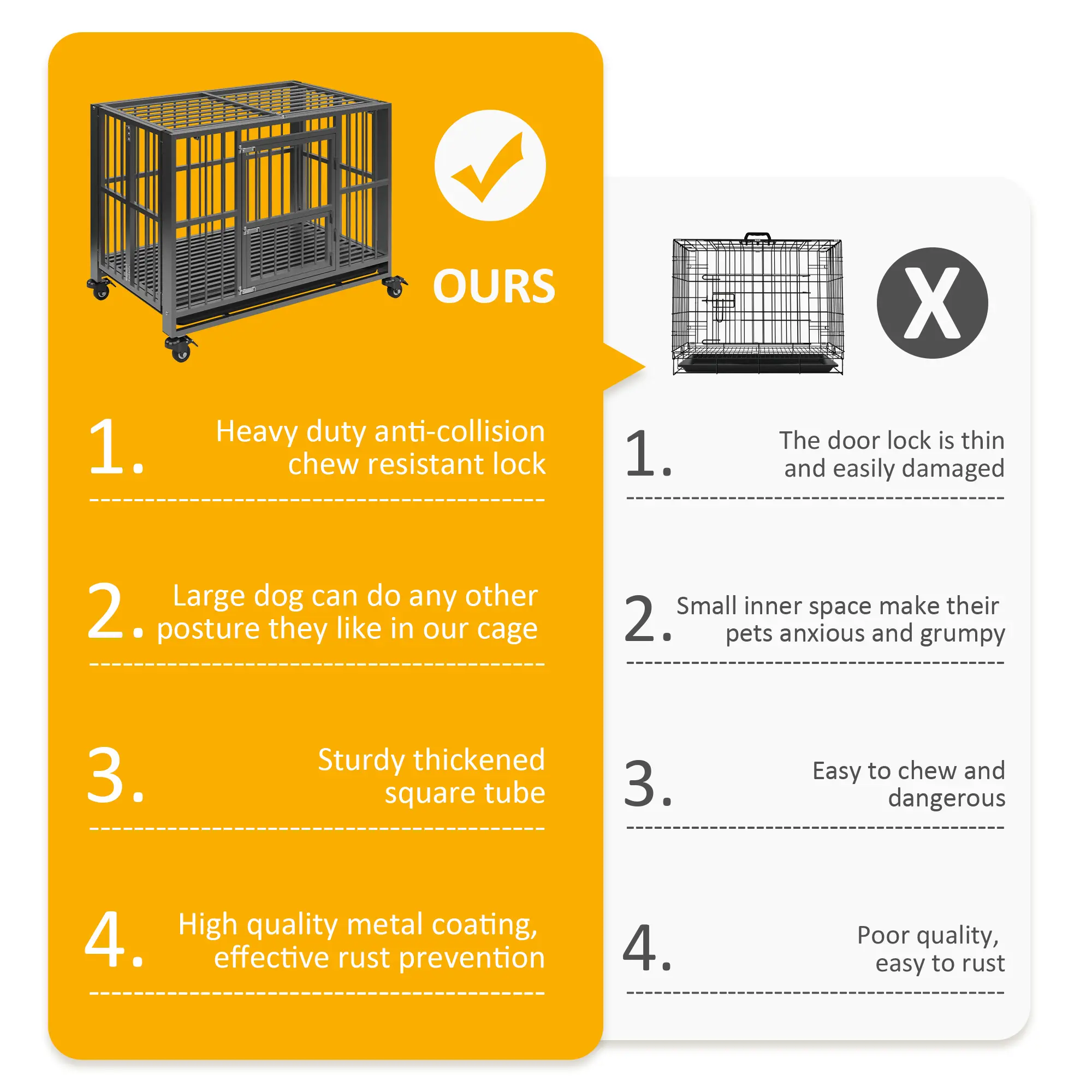 ·24 Hours Customer Service :We are dedicated to delivering heavy duty dog crates for your furry companions while prioritizing your shopping experience. Should any issues arise within 30 days of purchase, please reach out to us directly for a complimentary replacement or a full refund, ensuring your satisfaction and peace of mind.