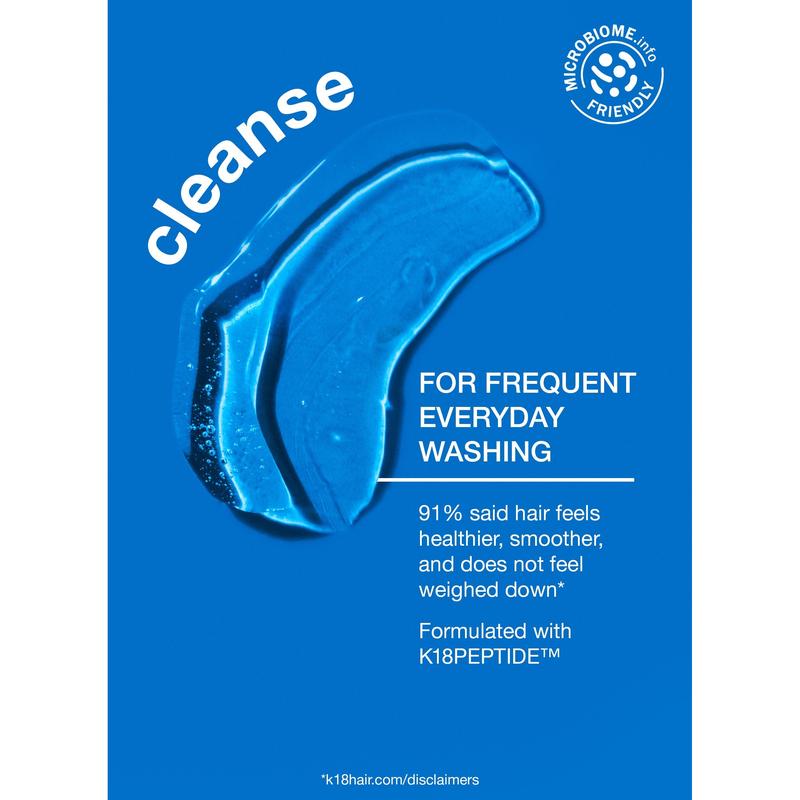 A color-safe, pH-optimized shampoo with the patented K18PEPTIDE™ to effectively cleanse while maintaining hair health and protecting hair from damage. pH-optimized formula helps reduce excess swelling of the hair cuticle during washing to help prevent frizz, preserve color, and enhance shine. Scalp microbiome-friendly and gentle enough to use every time you cleanse.