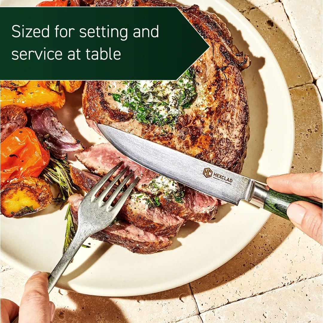 Made to the same exacting standards as our chef’s knife, each blade is forged from 67 layers of Japanese Damascus steel for incredible sharpness that glides through any protein. Featuring a mirror-finished blade and unique forest green pakkawood handle, they are the perfect table companions and elevate any meal.