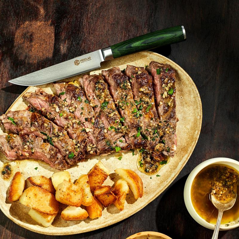 Our 4-piece Japanese Damascus steel steak knife set is for those who want to savor, not saw, their favorite meats. Made to the same exacting standards as our chef’s knife, each blade is forged from 67 layers of Japanese Damascus steel for incredible sharpness that glides through any protein. Featuring a mirror-finished blade and unique forest green Pakkawood handle, they naturally elevate any table setting.