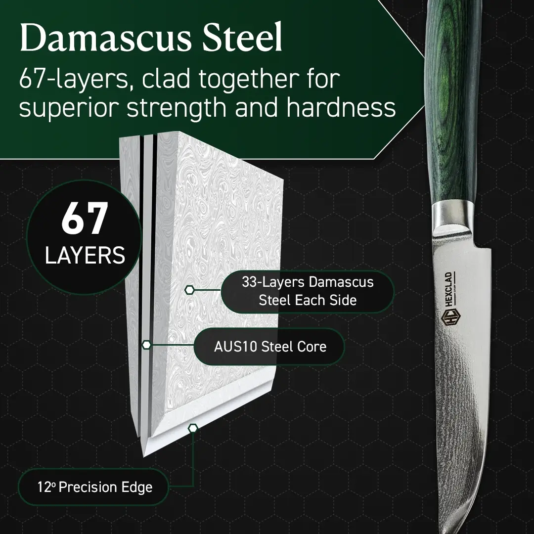 ·Forged blades comprise 67 layers of Japanese Damascus steel for a harder blade–a 60+ Rockwell rating.