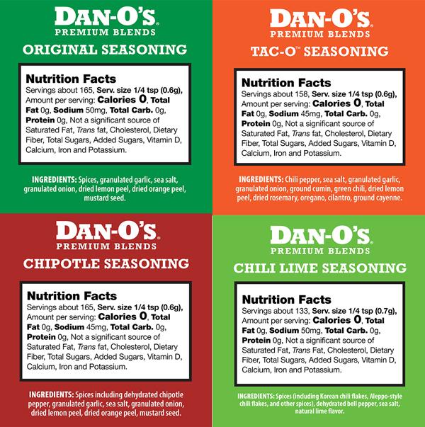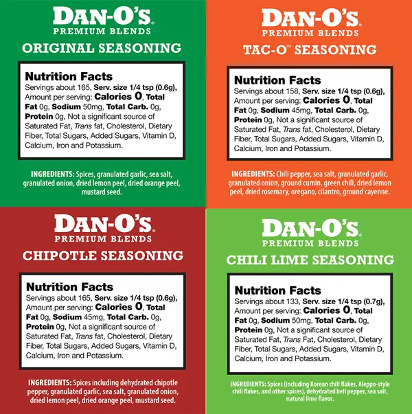 Dan-O's Original: Originally crafted with chicken in mind but versatile enough to elevate any dish, Dan-O’s Original Seasoning is a savory all-purpose seasoning that’s Dan good on almost anything! Made with our premium blend of mouth-watering herbs and spices with just the right amount of sea salt.