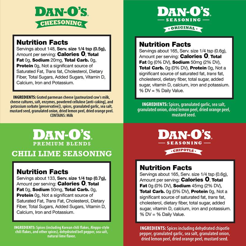 Dan-O’s Seasoning stands out with premium ingredients packed with herbs and spices and less salt than other brands. Our versatile seasoning suits any dish and diet while promoting healthy eating. Sprinkle Generously on meats for a Dantastic flavor, or get creative and try it on veggies, dips, pasta, popcorn, and more. Yum Yum Get Ya Sum!