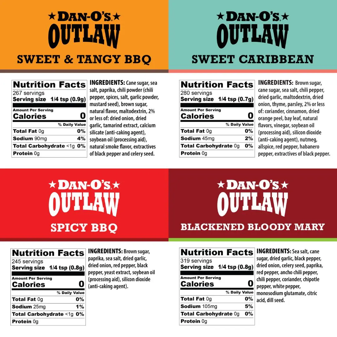 Dan-O’s Outlaw Sweet Caribbean is bursting with island-inspired flavors. It’s a balance of sweet, tangy, and spicy. From the warmth of habanero to the zest of orange peel, this blend transforms every dish into a Caribbean adventure. Sprinkle on the Dantastic and feel the vibe!