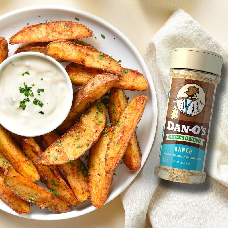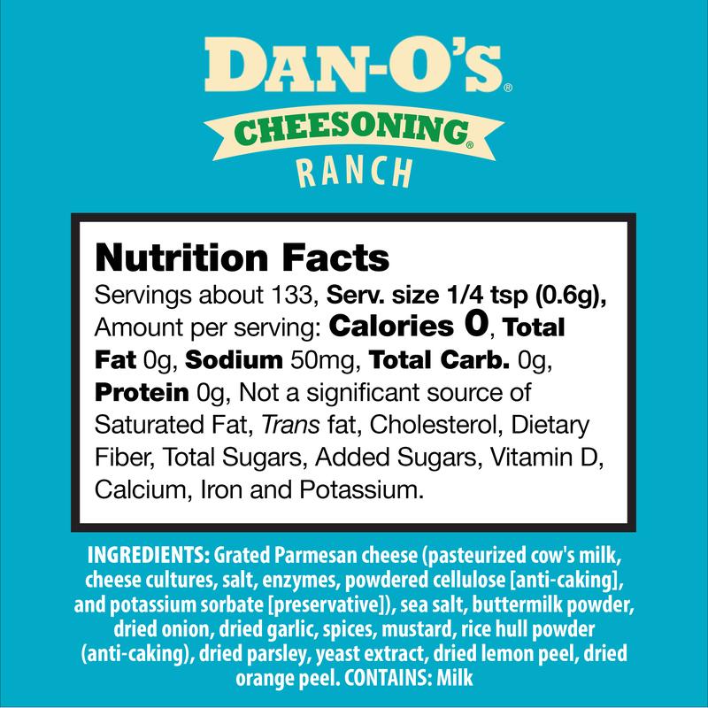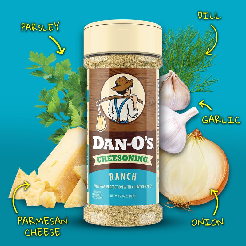 Meet the boldest ranch you’ve ever shaken. A flavor-rich creamy tang of ranch and the cheesy punch of real grated parmesan all in one bottle. Sprinkle it on fries, wings, veggies, popcorn, or pizza. Heck, we won’t judge if you eat it straight from the shaker. It’s Ranch. It’s Cheese. It’s Dan-O’s.