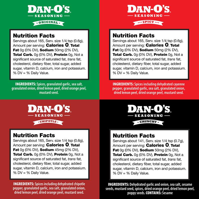 ·Dan-O’s Crunchy Seasoning brings the crunchy savory flavor of poppy seeds, sesame seeds, onion, and garlic to the classic Dan-O’s seasoning profile.