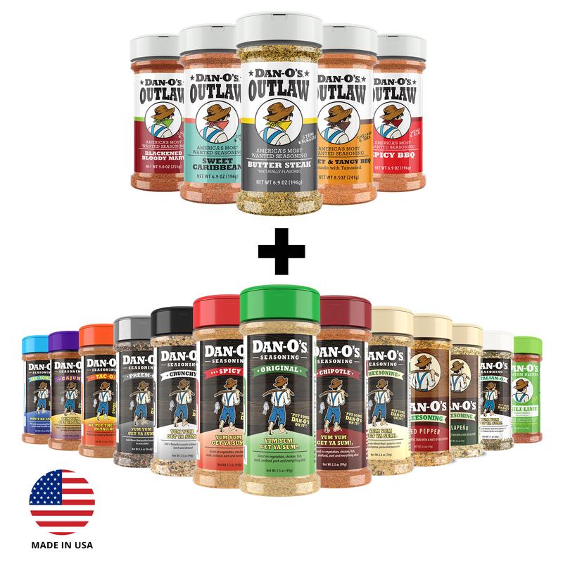 Dan-O's Seasoning 18 Bottle Combo includes all the flavors of Dan-O's in one pack! Original, Spicy, Chipotle, Crunchy, Cheesoning, Preem-O, Jalapeno Cheesoning, Tac-O, SEA-soning, Cajun, Italian-O, Red Pepper Cheesoning, Chili Lime + The Dan-O's Outlaws: Butter Steak, Blackened Bloody Mary, Sweet and Tangy BBQ, Sweet Caribbean, and Spicy BBQ