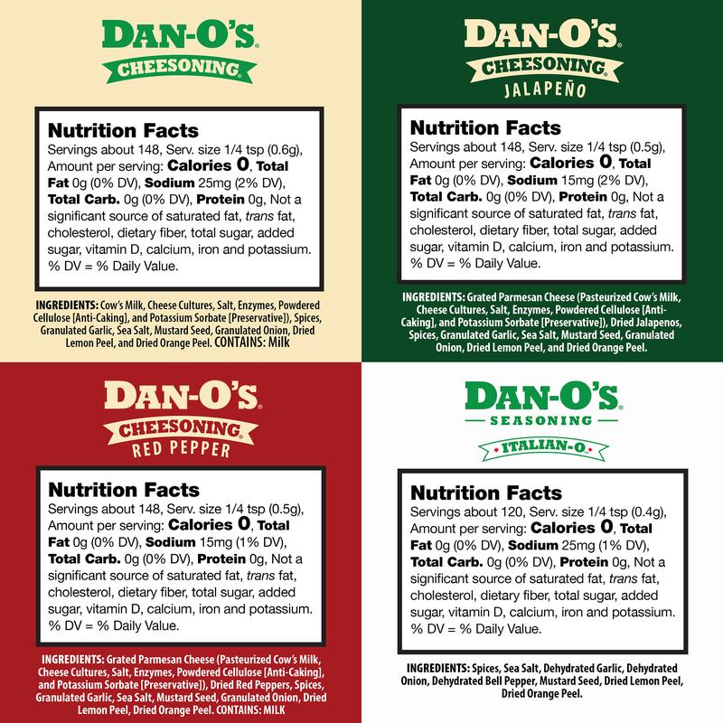 ·It’s Not Seasoning….it’s Cheesoning! Dan-O’s Cheesoning takes parmesan cheese to new heights with rich full-bodied parmesan combined with savory Italian herbs and spices like basil and oregano, and the distinctive flavor of Dan-O's Original.
