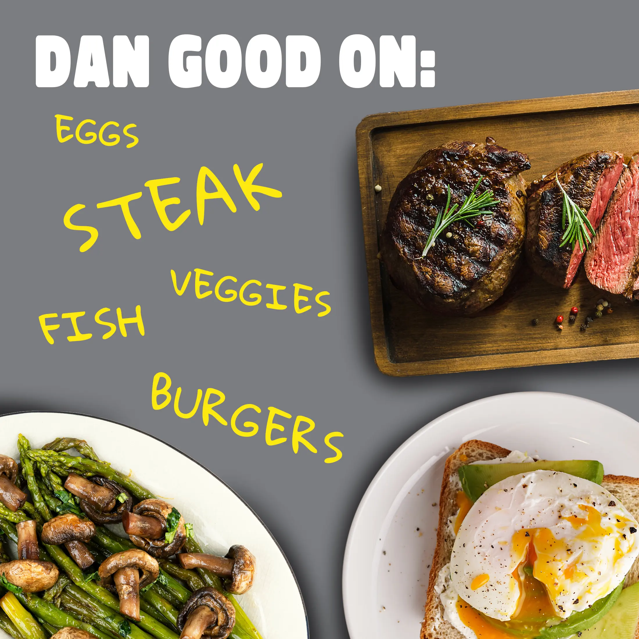 Dan Good on: Steak, Burgers, Chicken, Fish, Meats, Veggies