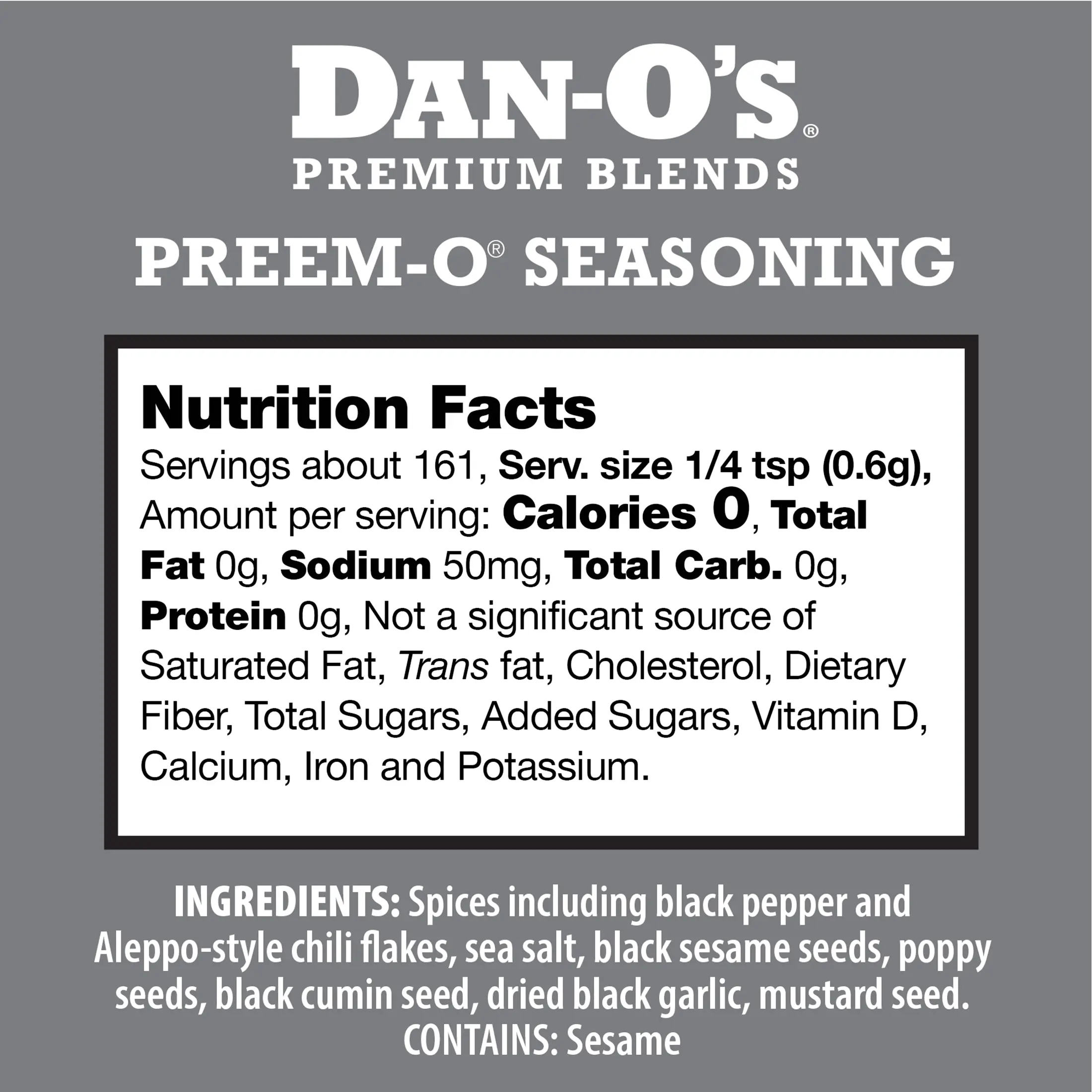 ·Meat Seasoning: Dan-O's Preem-O® is a unique mix of spices, herbs, garlic, and more, crafted to bring out the best in all your favorite meats. Whether it's steaks, burgers, pork, or chicken, Preem-O® adds that perfect touch to make every bite Dan-O-Myte®.
