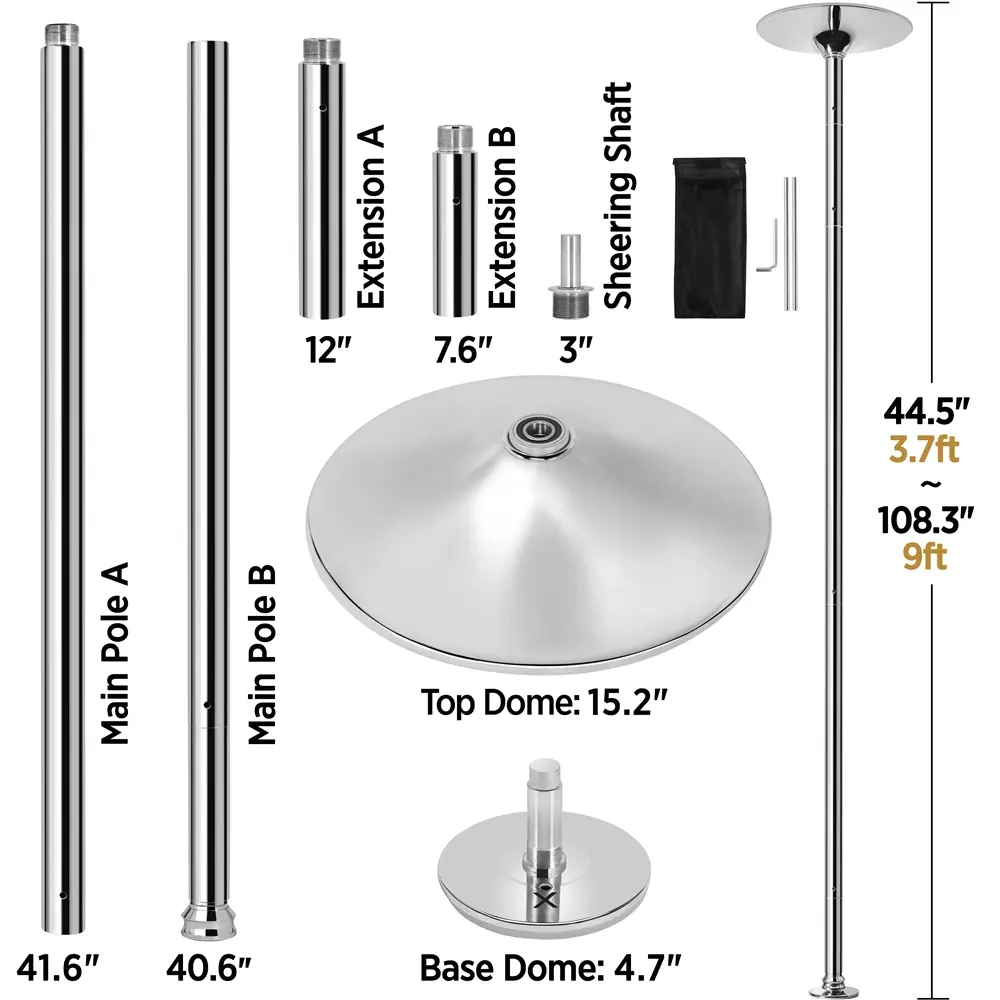 4.This adjustable dance pole set accommodates ceiling heights ranging from 7 to 9 feet. For ceilings exceeding 9 feet, additional extension poles must be purchased separately.