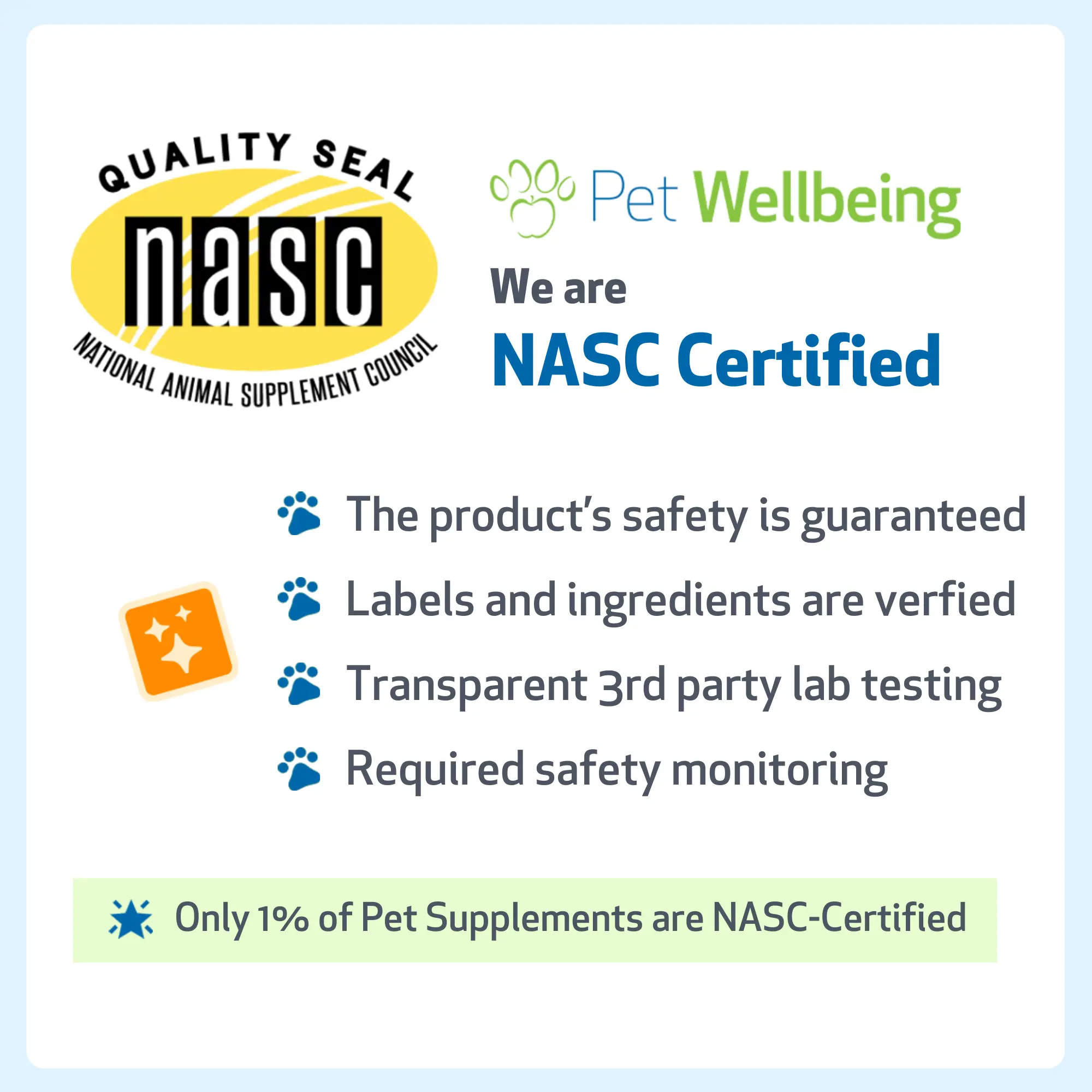 · NASC Certified Member: The National Animal Supplement Council (NASC) provides members with guidelines for rigorous quality standards, including GMP requirements, ingredient safety for animals, adverse event reporting (FDA), and transparency at every stage of making your pet's products.