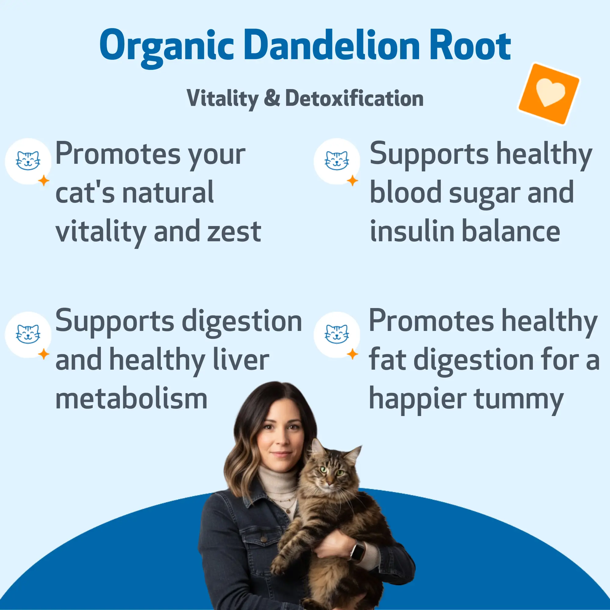 Liver Support: A healthy liver is vital for your cat's overall well-being. Dandelion Root supports the liver’s natural metabolic processes, helping to promote healthy toxin elimination and support the detoxification process.