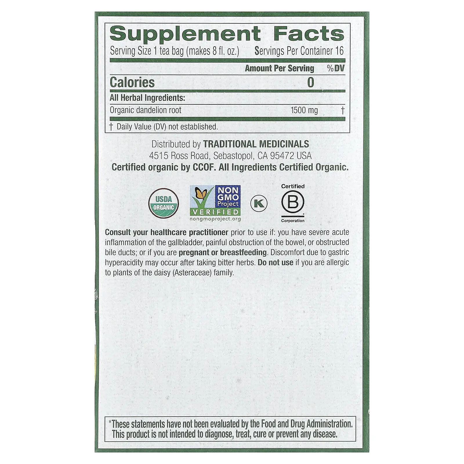 Traditional Medicinals Organic Roasted Dandelion Root, Caffeine Free, 16 Wrapped Tea Bags, 0.85 oz (24 g)