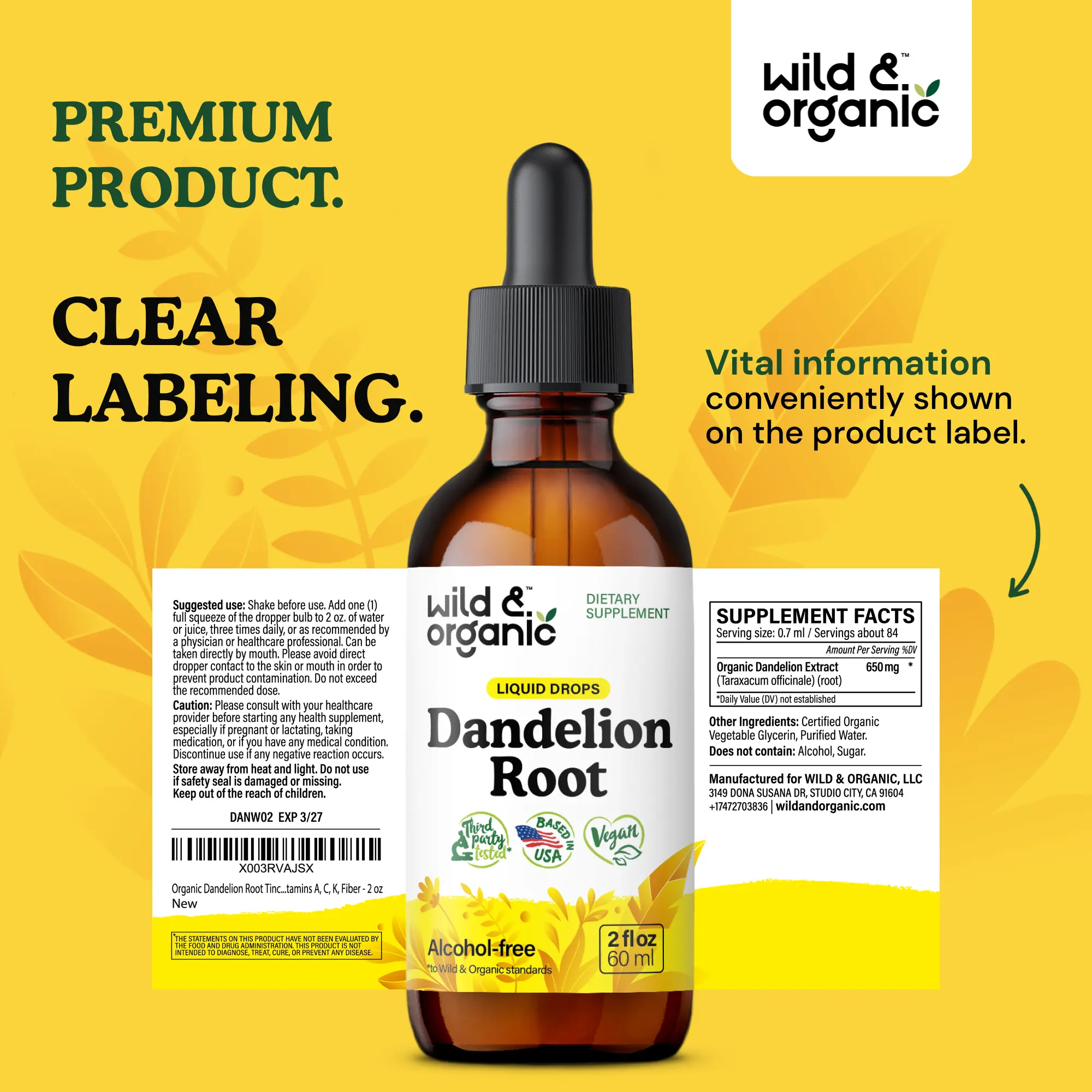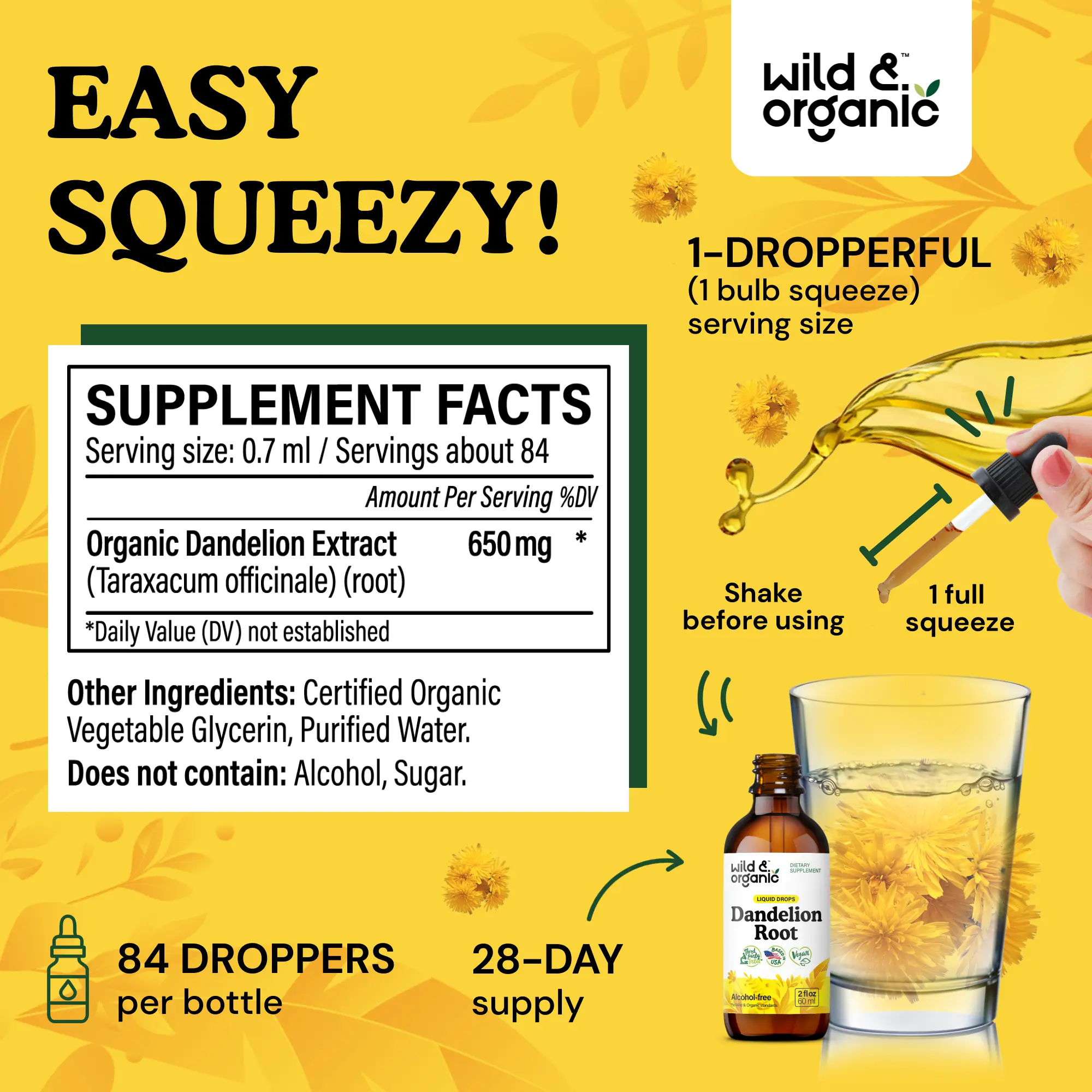 Liver Support: Each serving of Wild & Organic's dandelion root tincture contains 689 mg of dandelion root extract for liver support.