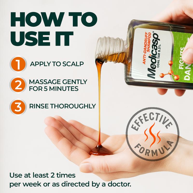 ·Medicasp Shampoo Results: Use twice a week to control and fight the symptoms of Dandruff, Seborrheic Dermatitis and Scalp Psoriasis and help prevent the recurrence of scalp itching, redness and irritation associated with dandruff flakingfeatures 0.5 percent coal tar