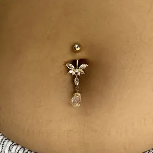 This navel piercing is crafted with a gold pvd on 316L stainless steel 14G barbell with a 5mm clear cz gem top and a beautiful half flower shaped bottom made out of round and marquise clear cz gems. Attached is a dangling marquise clear cz gem and a faceted clear teardrop charm. The design (including dangle) measures at about 30mm x 14mm. Size is 14G with a 3/8" (10mm) barbell. Externally threaded, this navel barbell is designed for healed piercings. Sold individually (1pc).