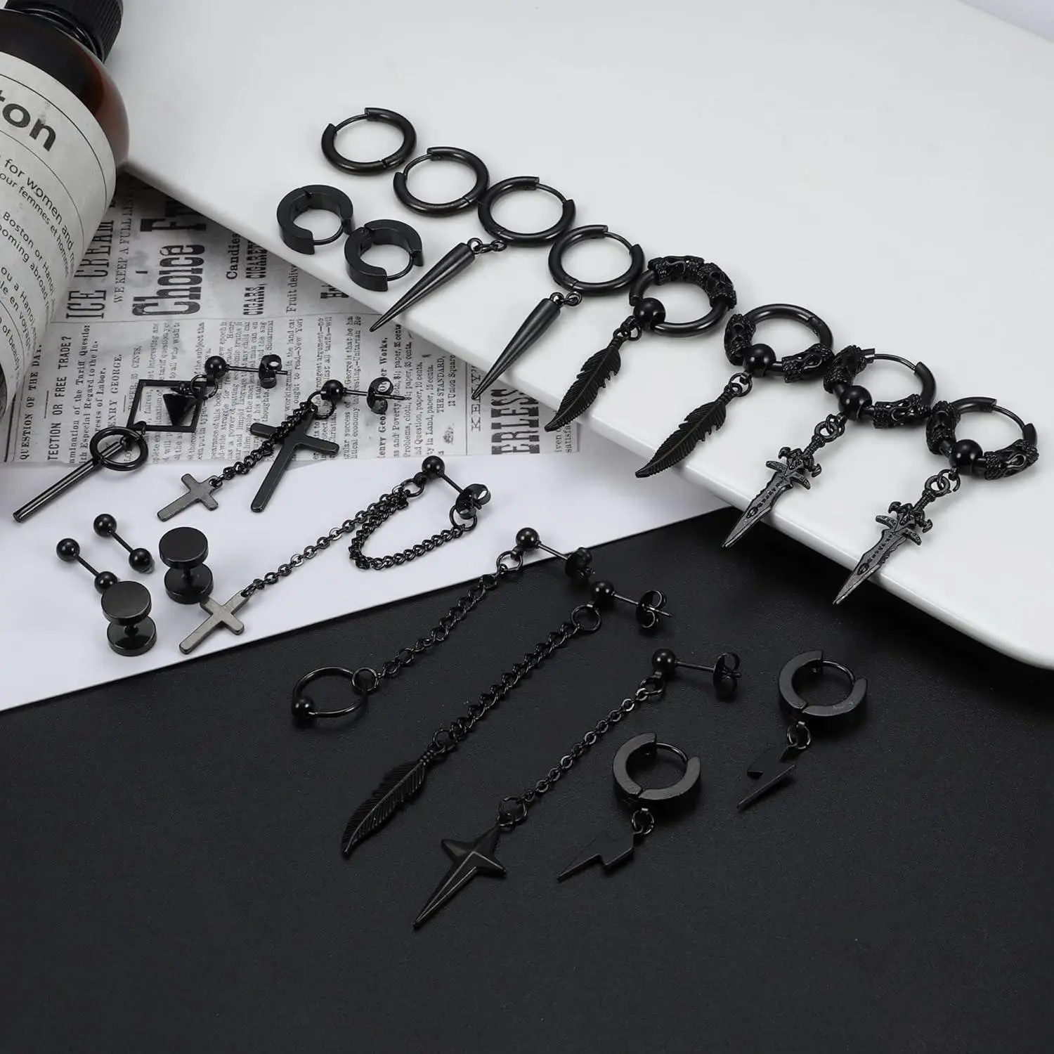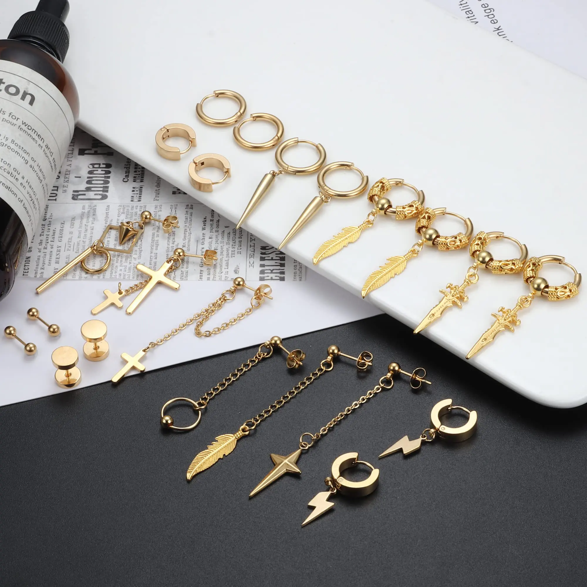 22 Count MEN’S EARRINGS-- Contains Hoop Earrings, Hoop Dangle Earrings, Stud Earrings And Stud Earrings With Chain. This Set Of Unisex Earrings Are Equipped With Novel Crosses, Feathers, Lightning, Swords, Dumbbells, Chains And Other Fashionable Elements. It Is A Trendy Accessory You Can’t Miss.