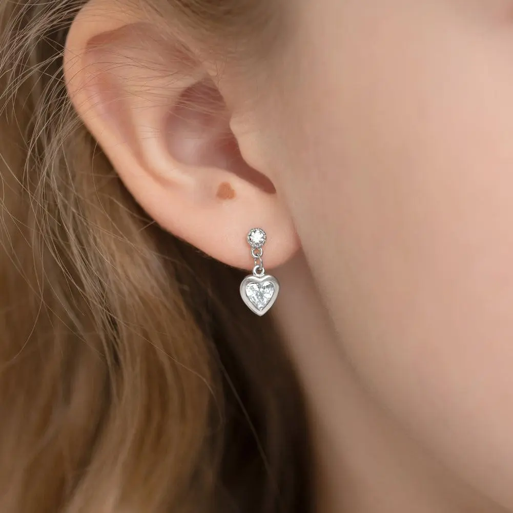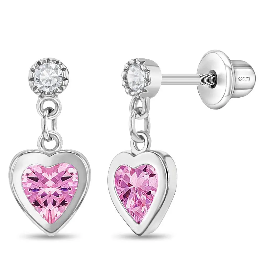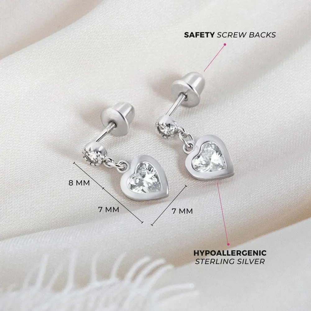 Sweet and sparkly, these dangle heart earrings are a lovely way to show a little love! Made from 925 sterling silver, each earring features a delicate dangling heart accented with a shimmering simulated cubic zirconia that catches the light beautifully. Designed with comfort and safety in mind, they are hypoallergenic for children with sensitive ears. They feature secure screw back closures to keep them snug and in place all day. A small gift box is included with purchase.