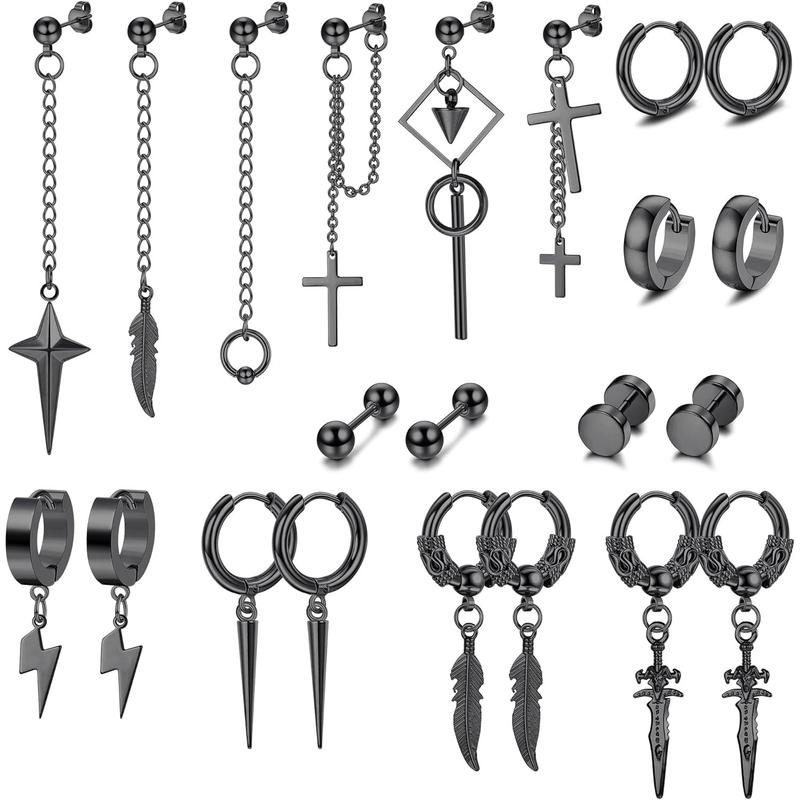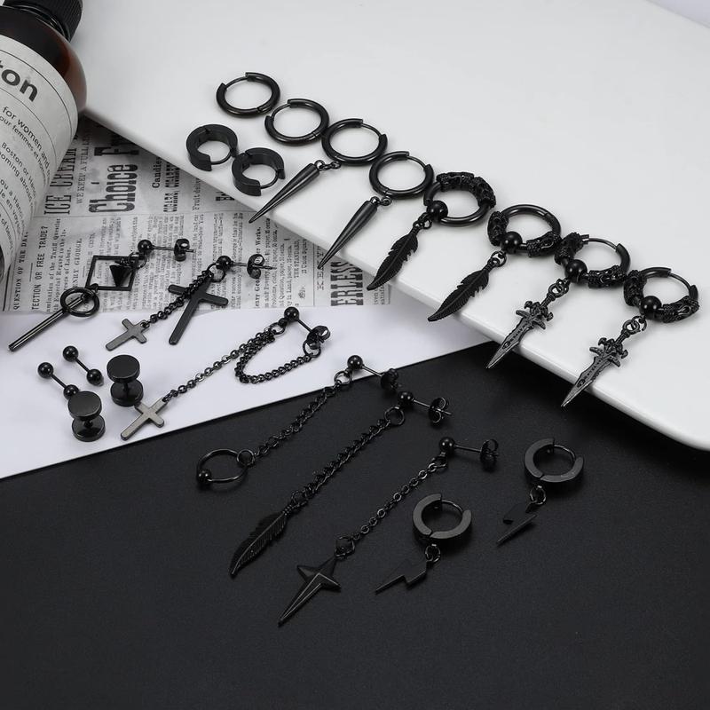 5. Sanfenly 22pcs Men's Dangling Earrings Stainless Steel with Hinges Hoop Earrings Long Chain Stud Cross Earrings Set Kpop Men's Earrings Black