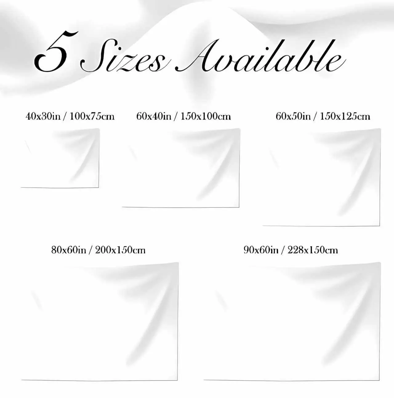 30x40in/76cm(width) x 102cm(height), 40x60in/ 102cm(width) x 152cm(height), 60x80in/ 152cm(width) x 203cm(height), 60x90in/ 152cm(width) x 229cm(height)