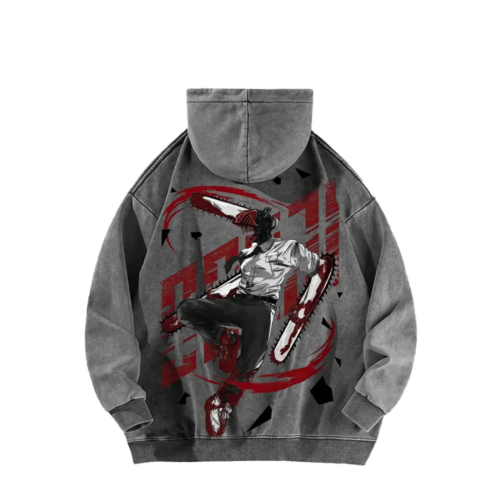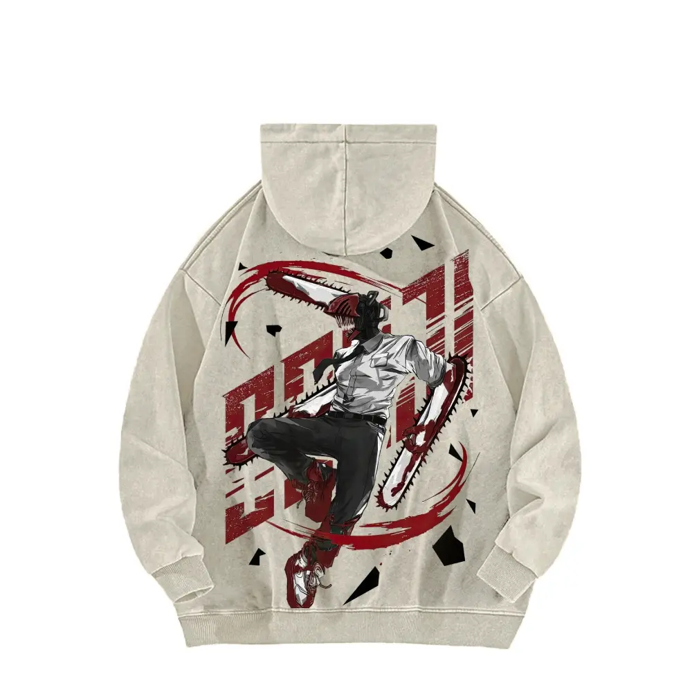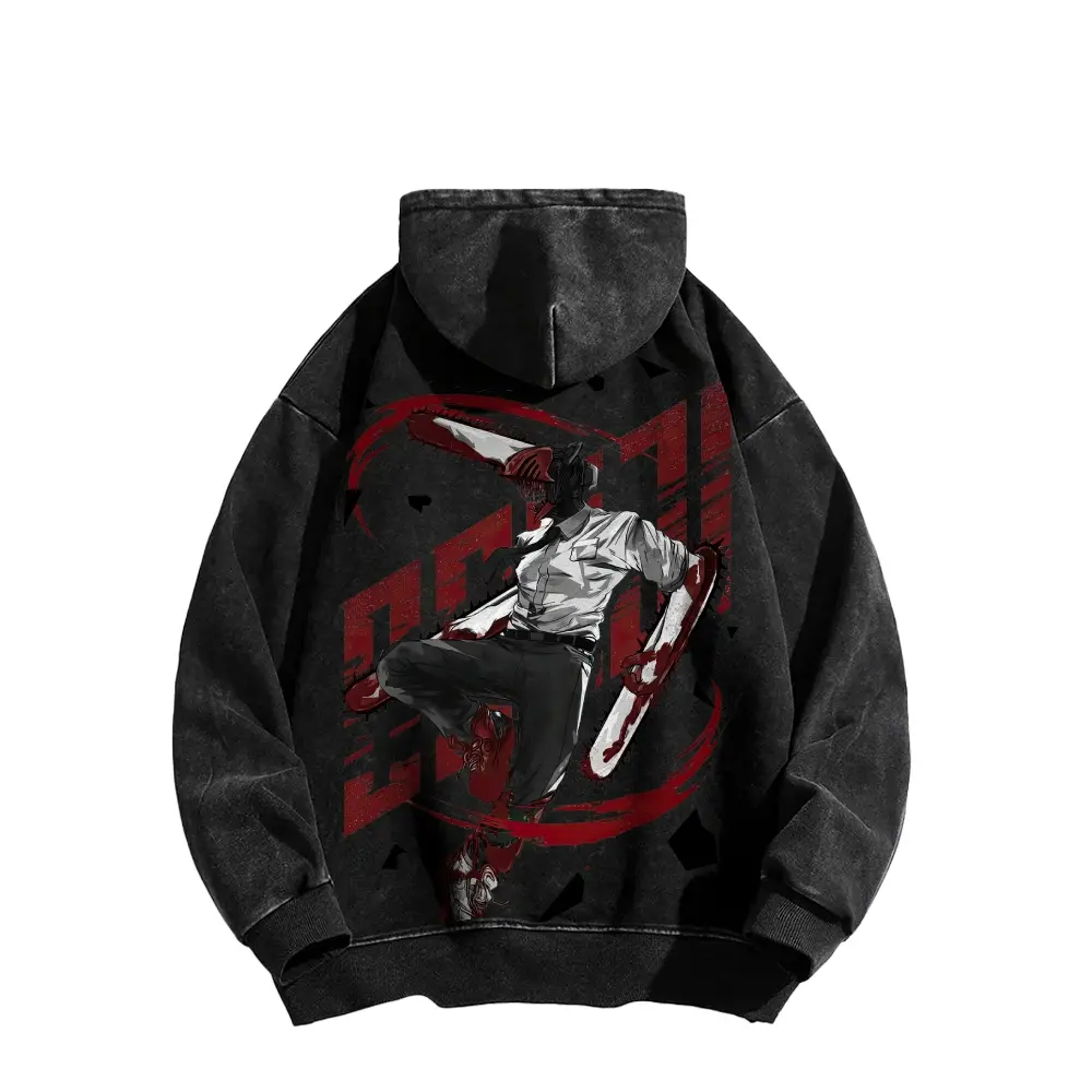 Dante, the protagonist of Chainsaw Man, is wearing a double-sided hooded sweatshirt made of pure cotton, unisex, with a pattern, in an American style.