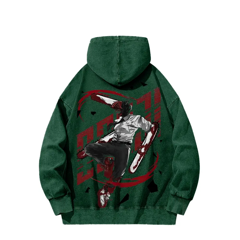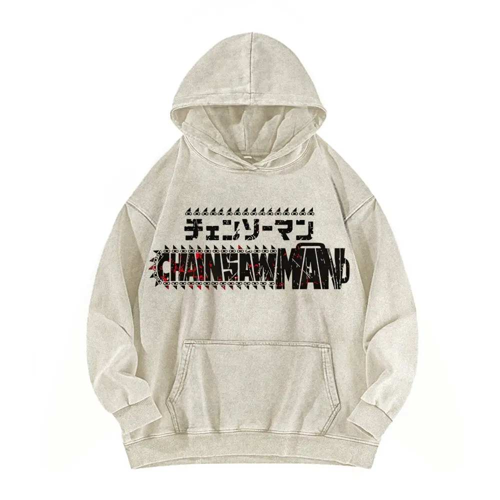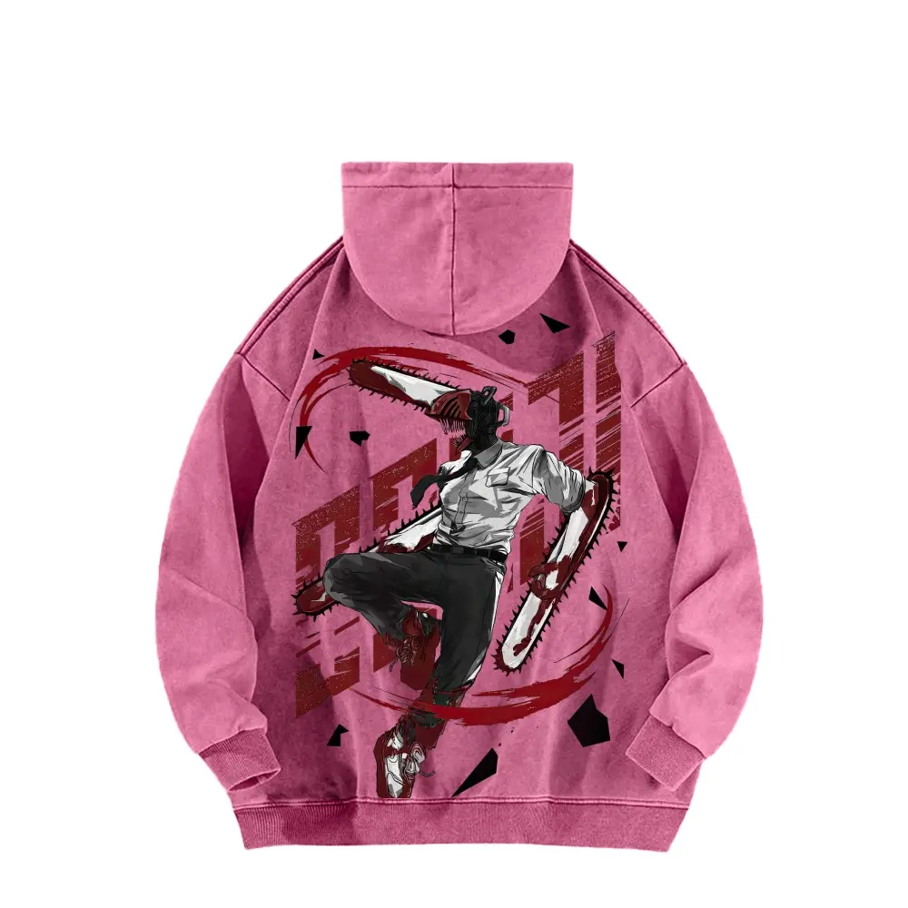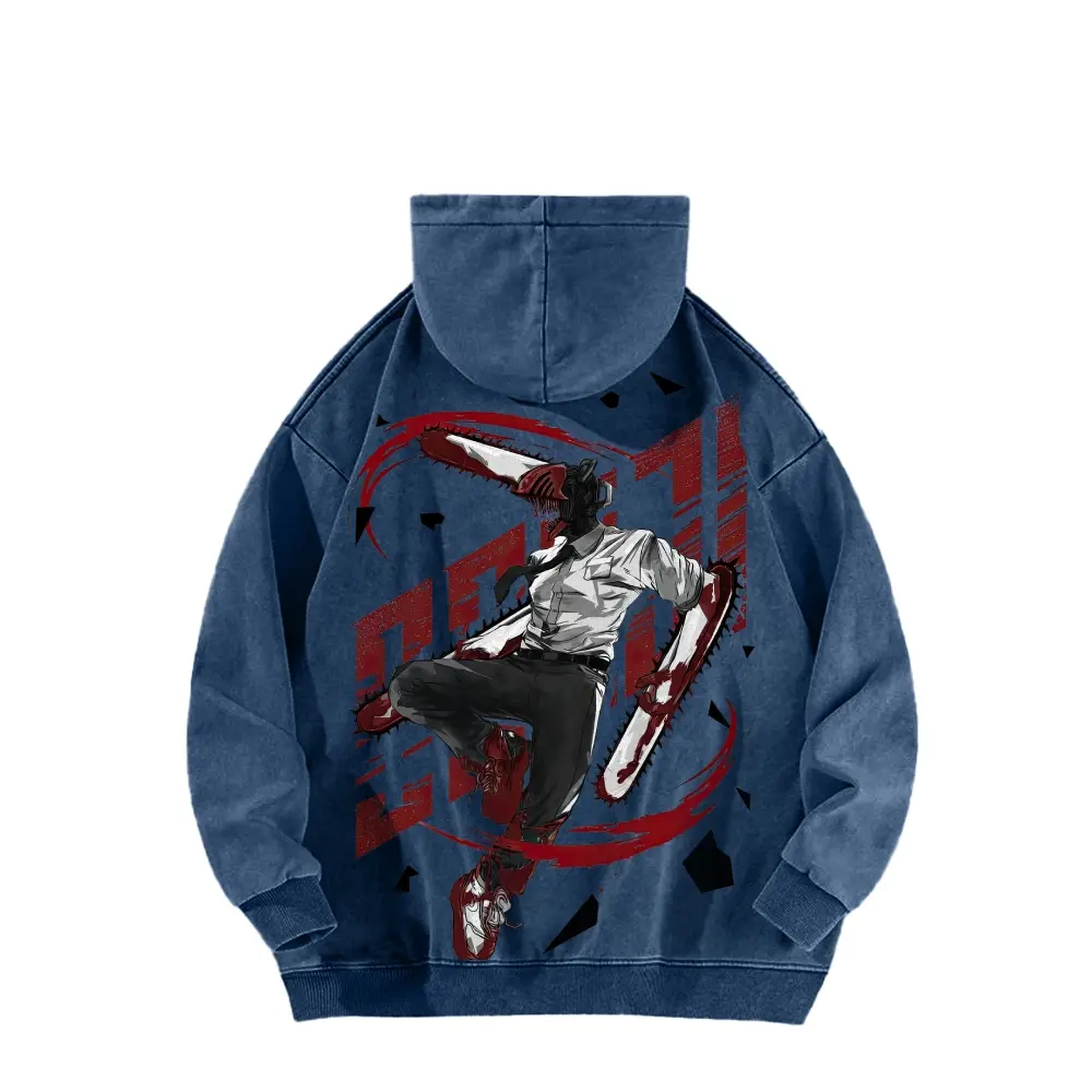 Dante, the protagonist of Chainsaw Man, is wearing a double-sided hooded sweatshirt made of pure cotton, unisex, with a pattern, in an American style.
