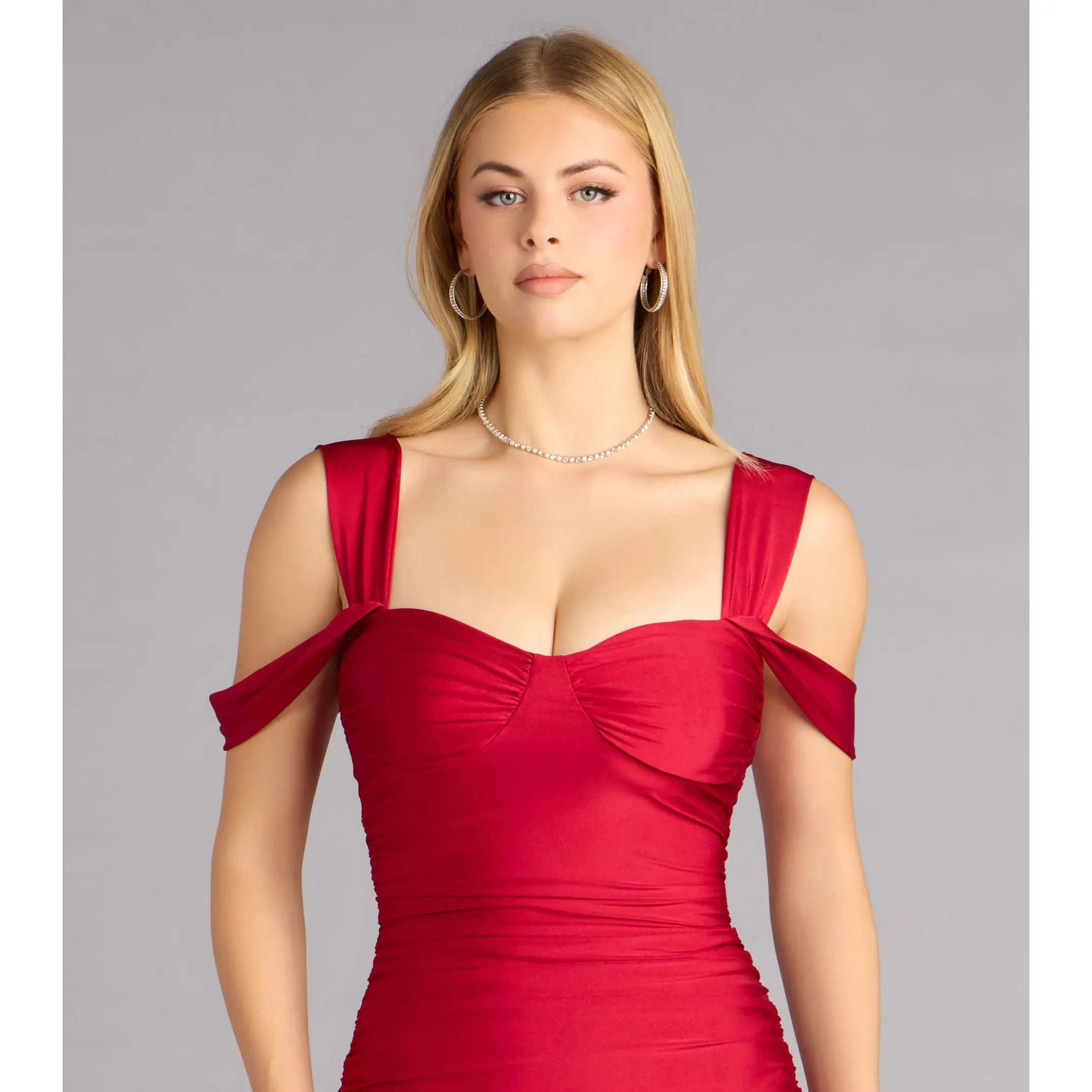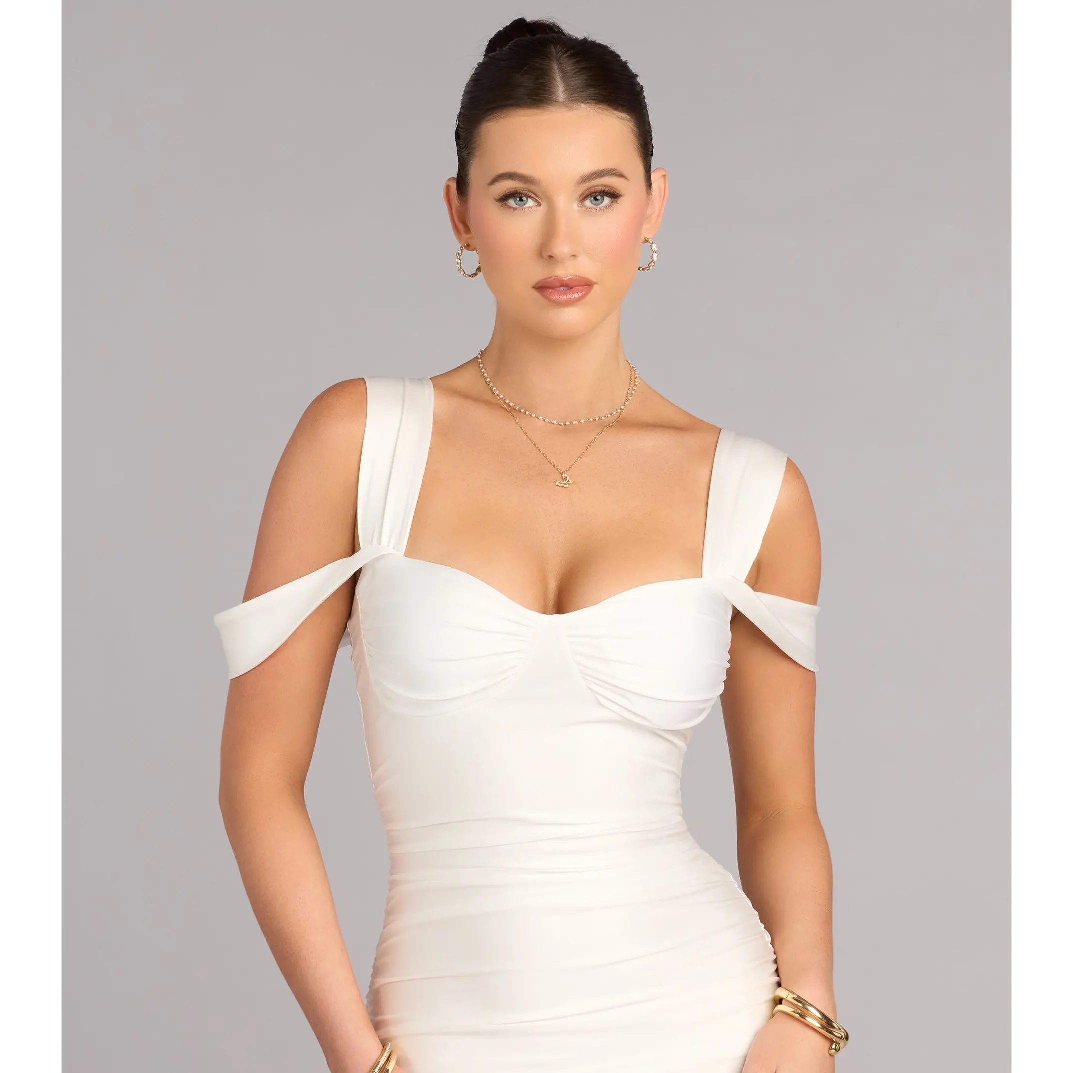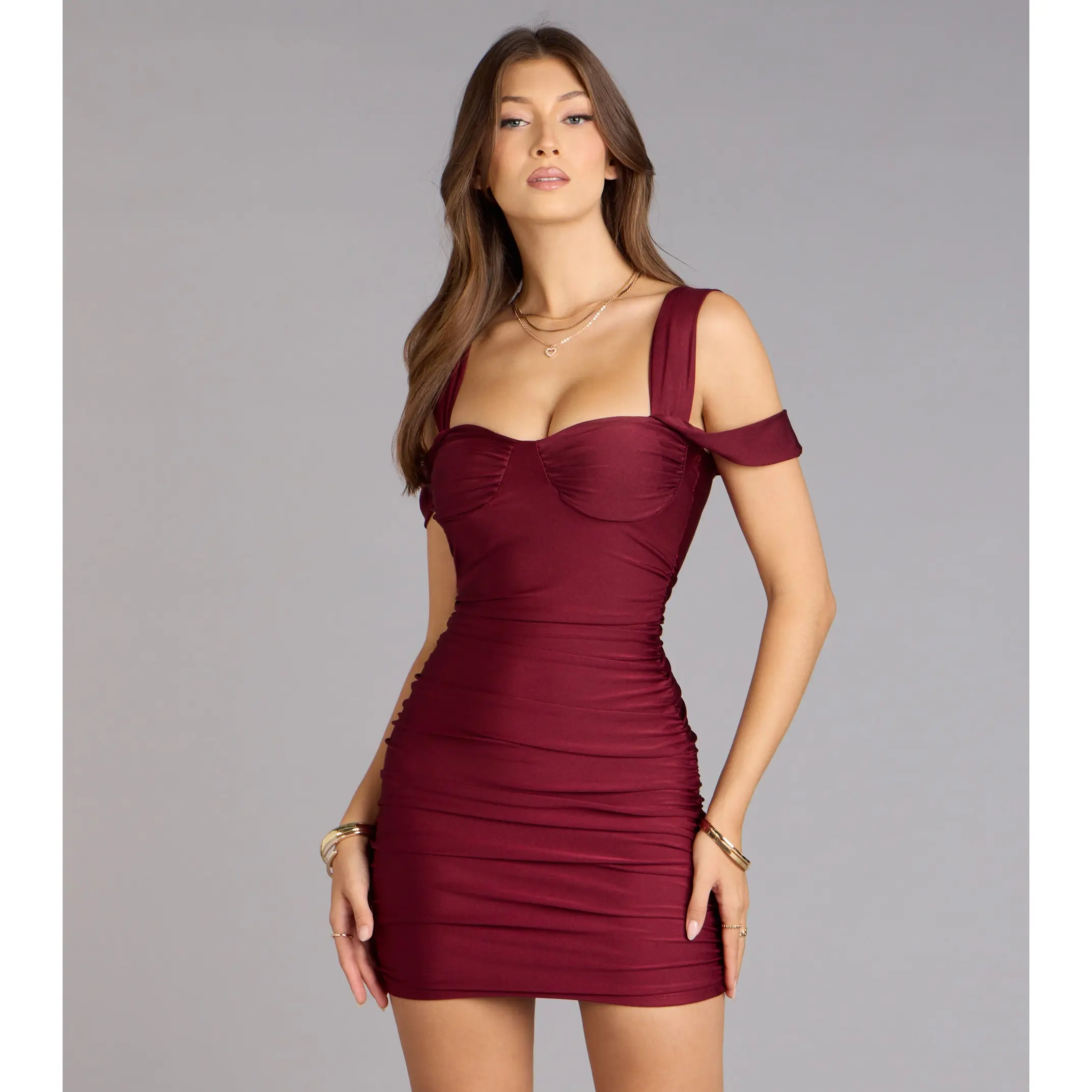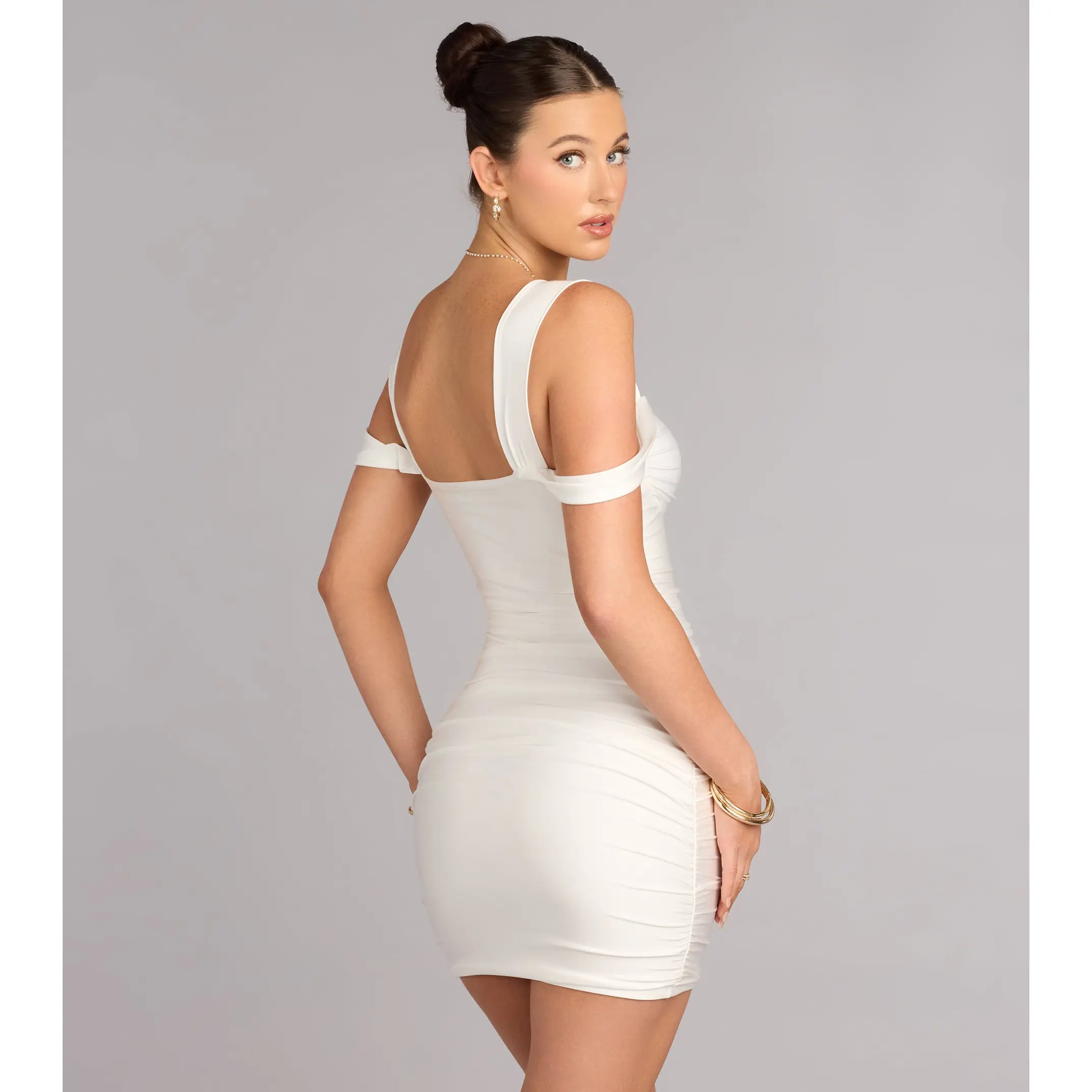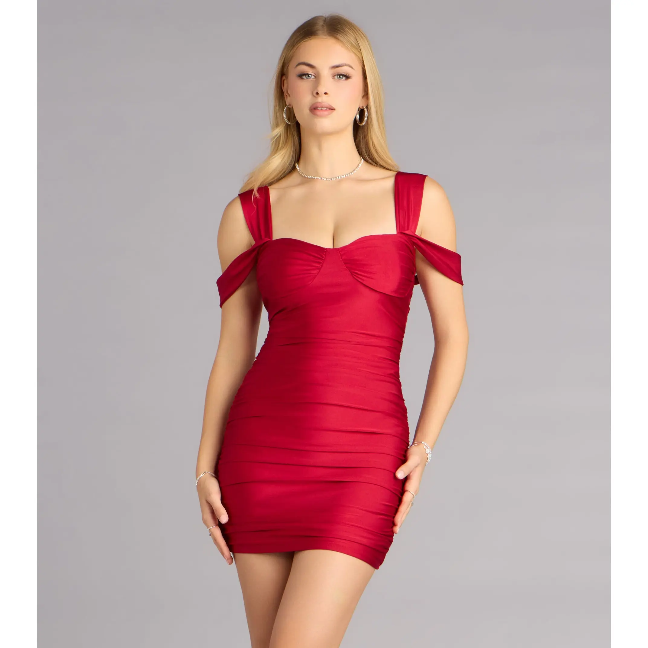Built to stun the second you walk in. This bodycon mini dress hugs every curve with bold cold-shoulder straps that serve just the right amount of drama.