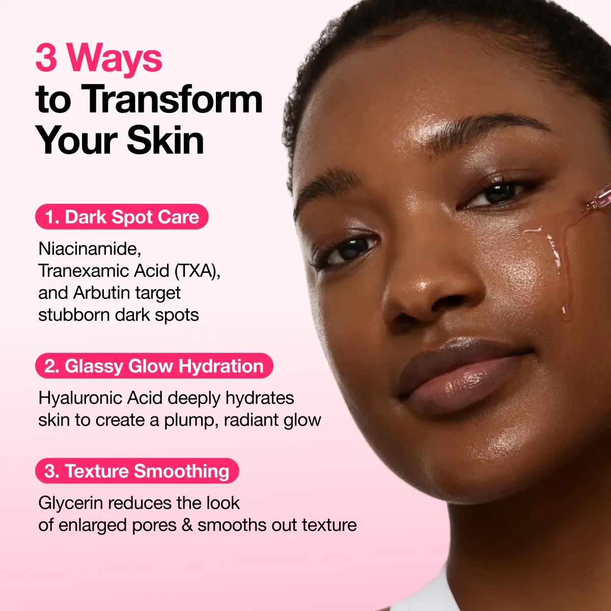10% Niacinamide helps reduce discoloration by improving the look of uneven pigmentation4% Tranexamic Acid helps visibly fade the look of dark spots and supports a more even-looking skin toneTarget unwanted stubborn dark spots and hyperpigmentationHelps improve the appearance of discoloration and balance the look of skin toneSkin looking less dull and red with continued useEven skin tone with brighter and healthier complexion