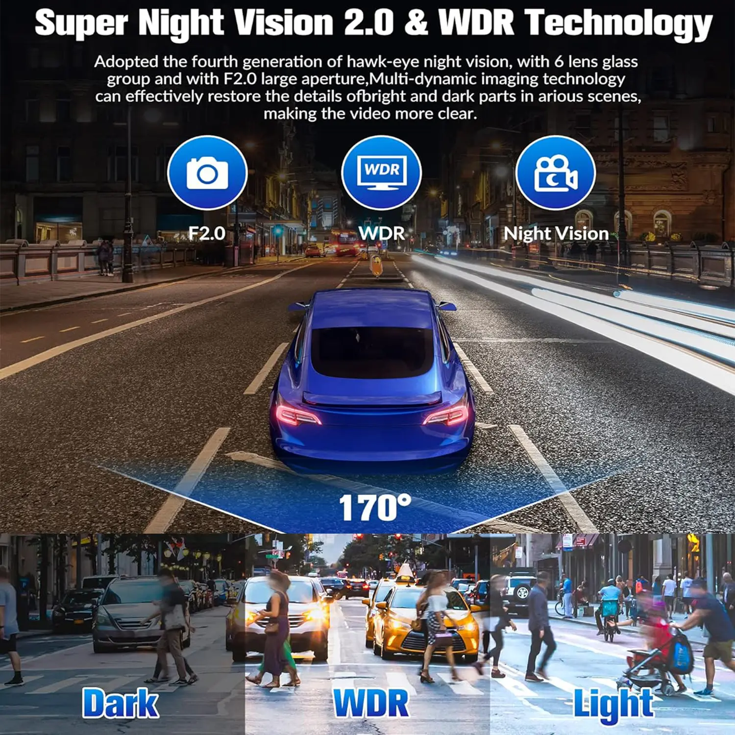 ·【Dash Cam】The dashcam with super night vision and infrared cabin light uses f/2.0 wide aperture with a total of 6 layers of optical lens and WDR technology, coupled with 4 infrared lights, enabling the car camera to show good color accuracy and clearly capture important details day or night.