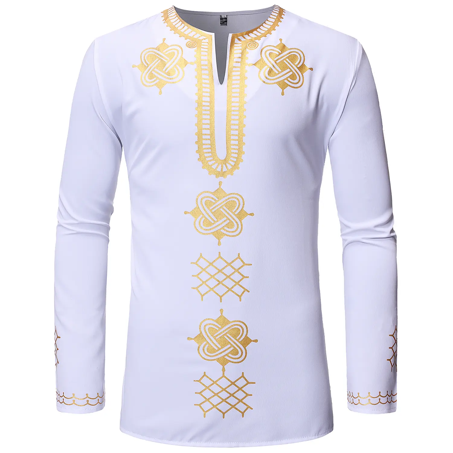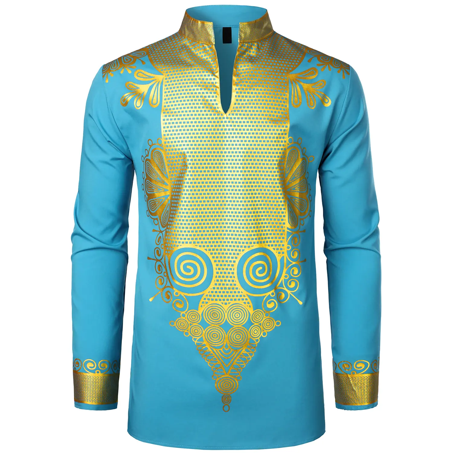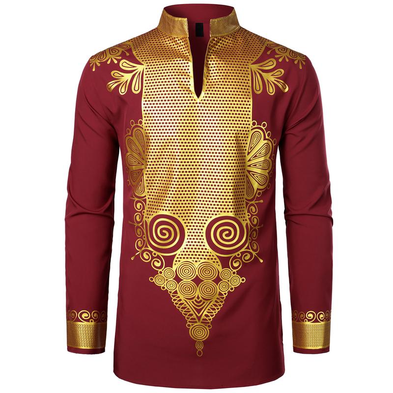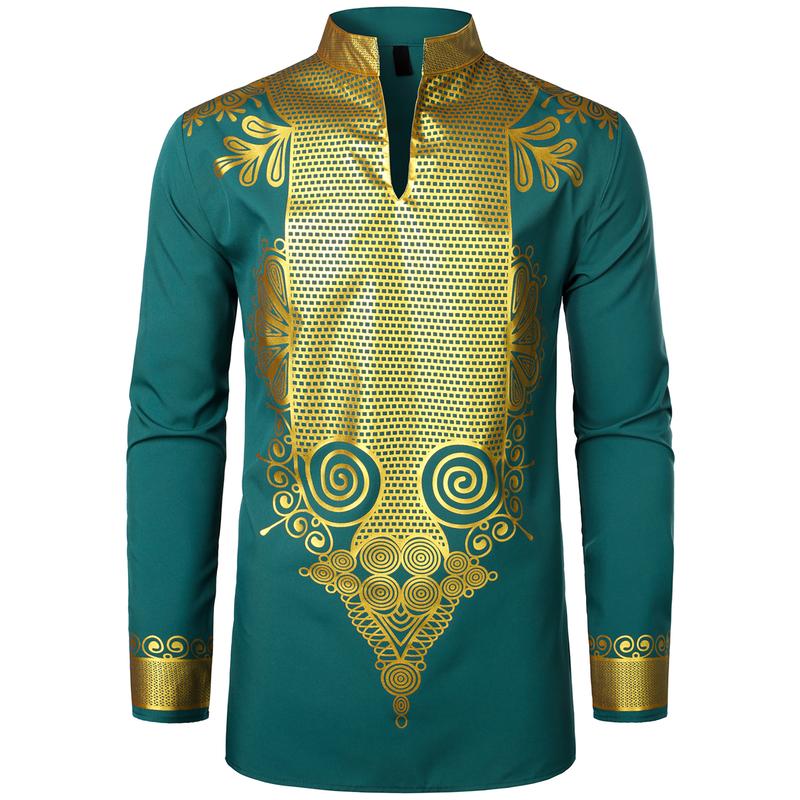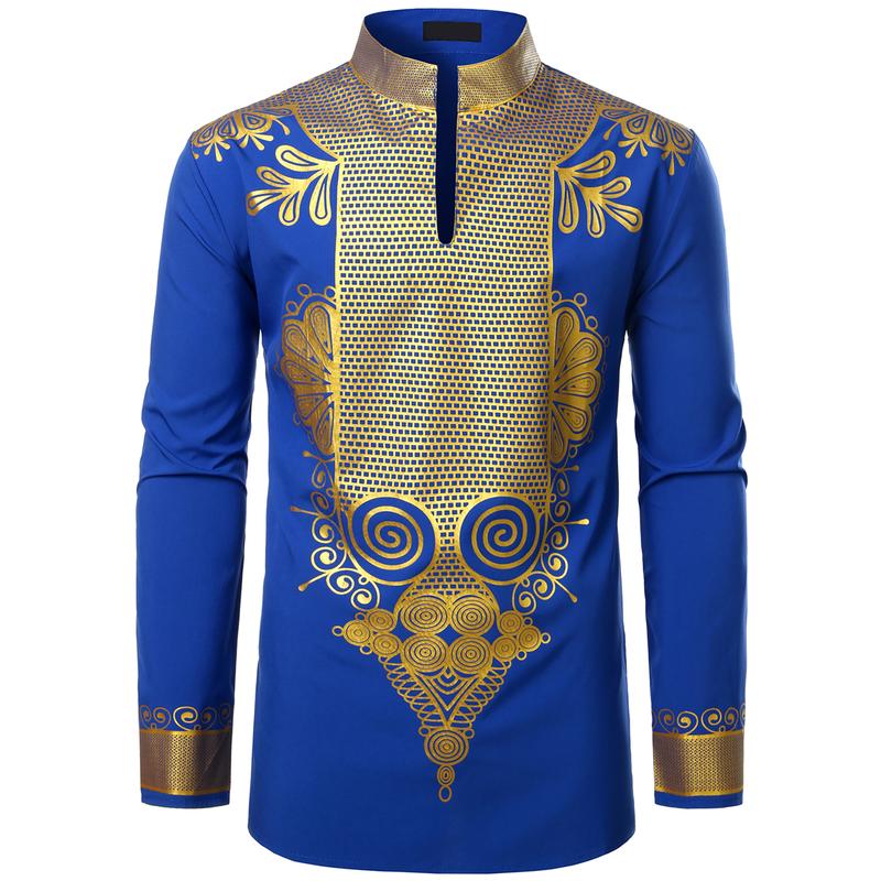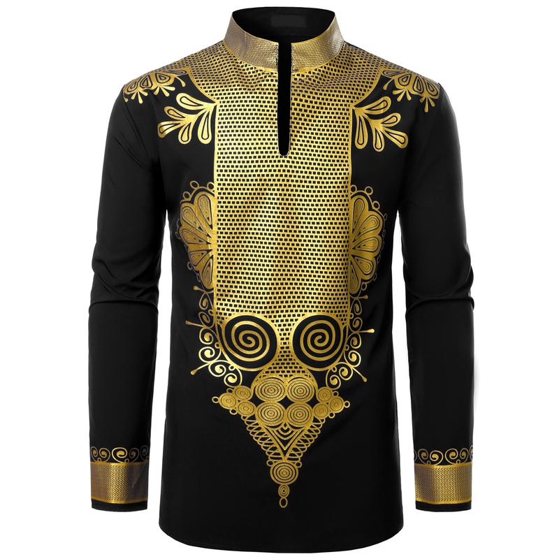 ·STYLE: A very eye-catching ethnic style top,If you're hesitant to wear it to a party, buy this dress now!Spring Autumn Tops/3 Button/Henley Neck/Long Sleeves/Slim Fit/Mandarin Collar ;Hot Stamping Process/Shiny Africa Pattern Design/Traditional African Tribal Ethnic Clothing/Luxury Retro Fashion Style