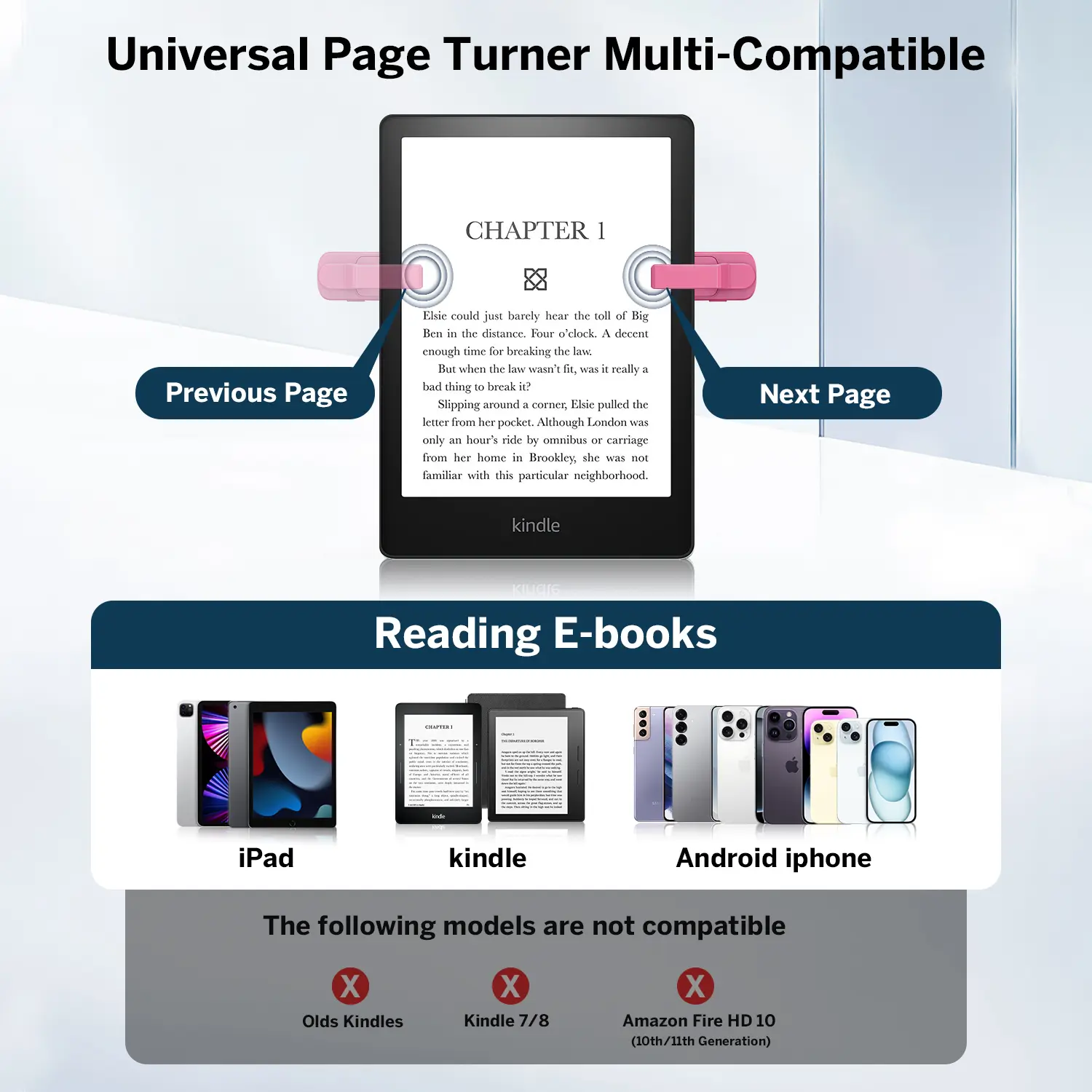 Compatible with Kindle, Kindle Paperwhite, Kindle Oasis, Kindle Kids Edition, Kindle Voyage, Android Tablets, Surface, Kobo, iPhone iPad page turner. (Incompatible Devices: Kindle 7/8th Generation, Amazon Fire HD 10 (10th/11th generation)