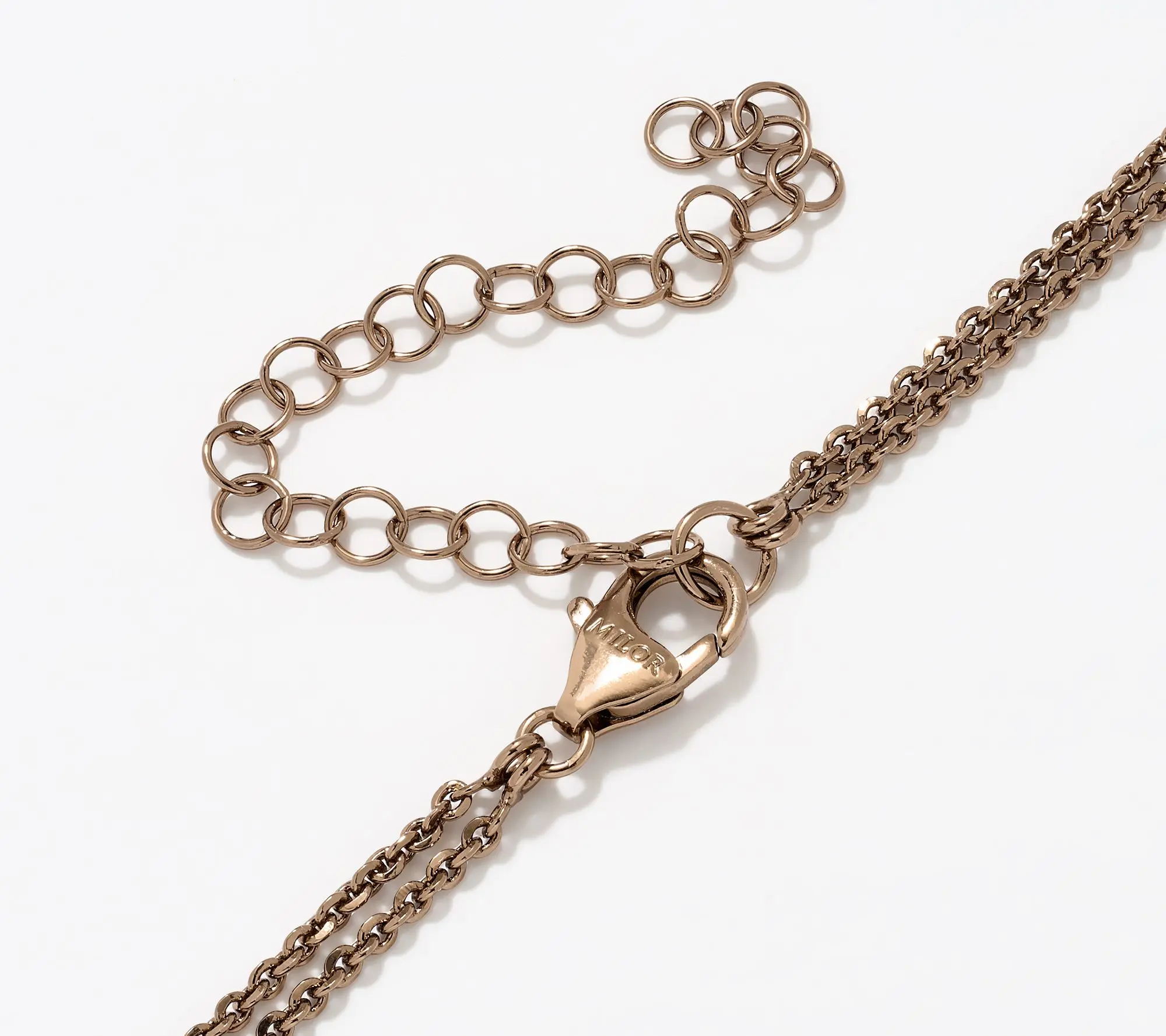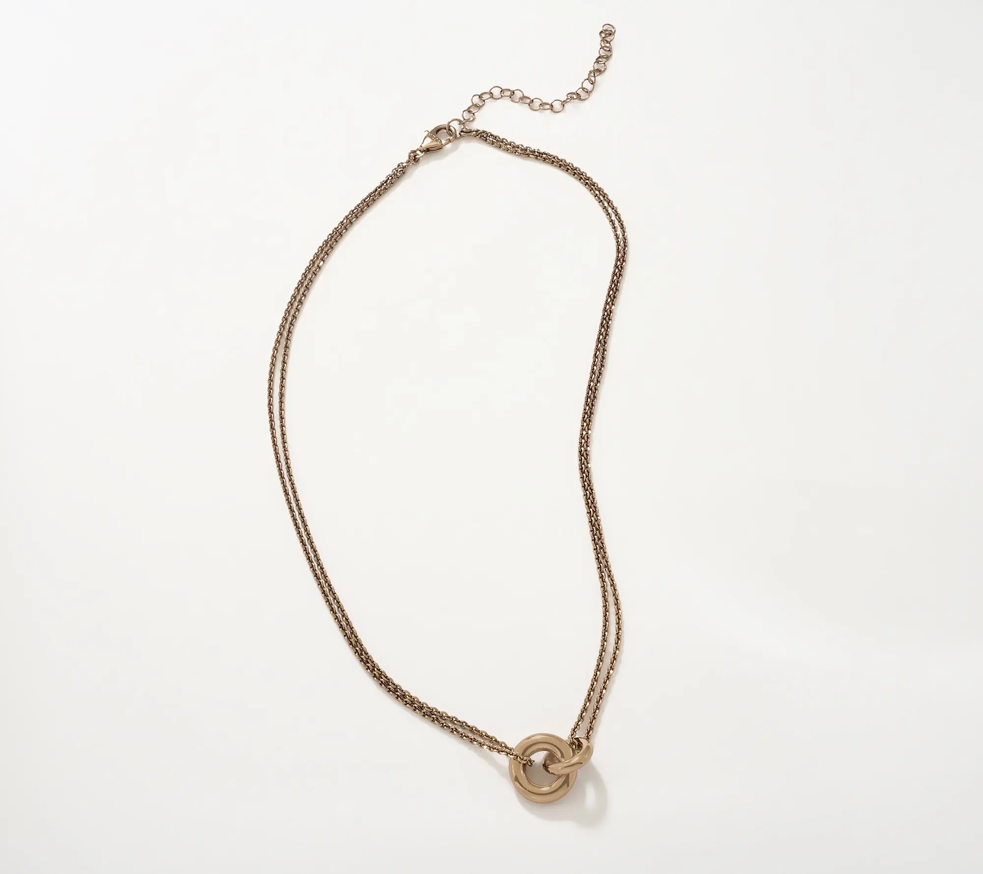 From the David Markstein Bronze Collection comes this "Two Circles, One Love" necklace featuring double strand forzatina chain and double cicle elements. Lobster clasp closure. Polished finish. Choice of colorways: Rhodium or 18K Yellow gold or 18KT Mocha plated Bronze or Two-Tone with Rhodium and Yellow plating or Two-Tone with Mocha plating. Measures approximately: chain 17"L + 3" extender x 1/8"W; drop 1/2"L x 5/8"W. Comes Boxed with Pouch and Romance Card.